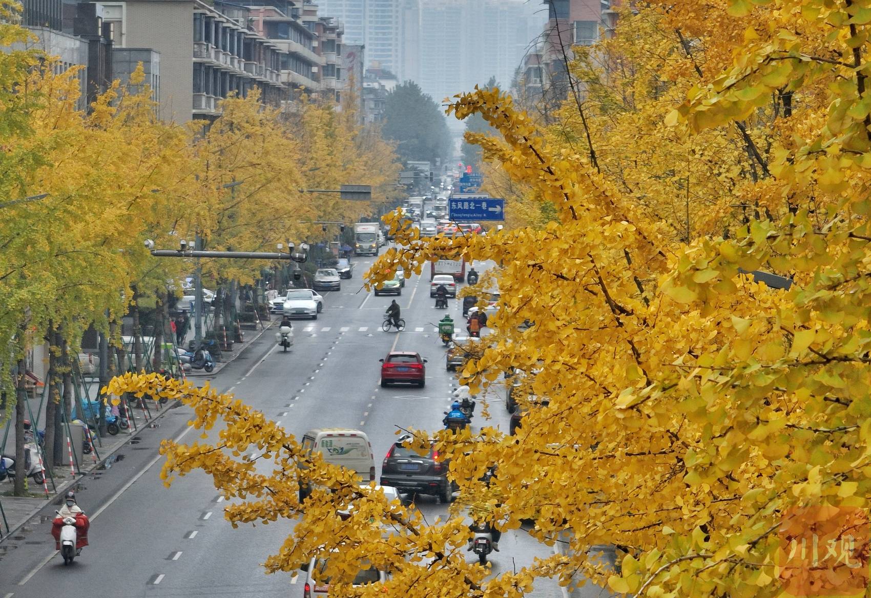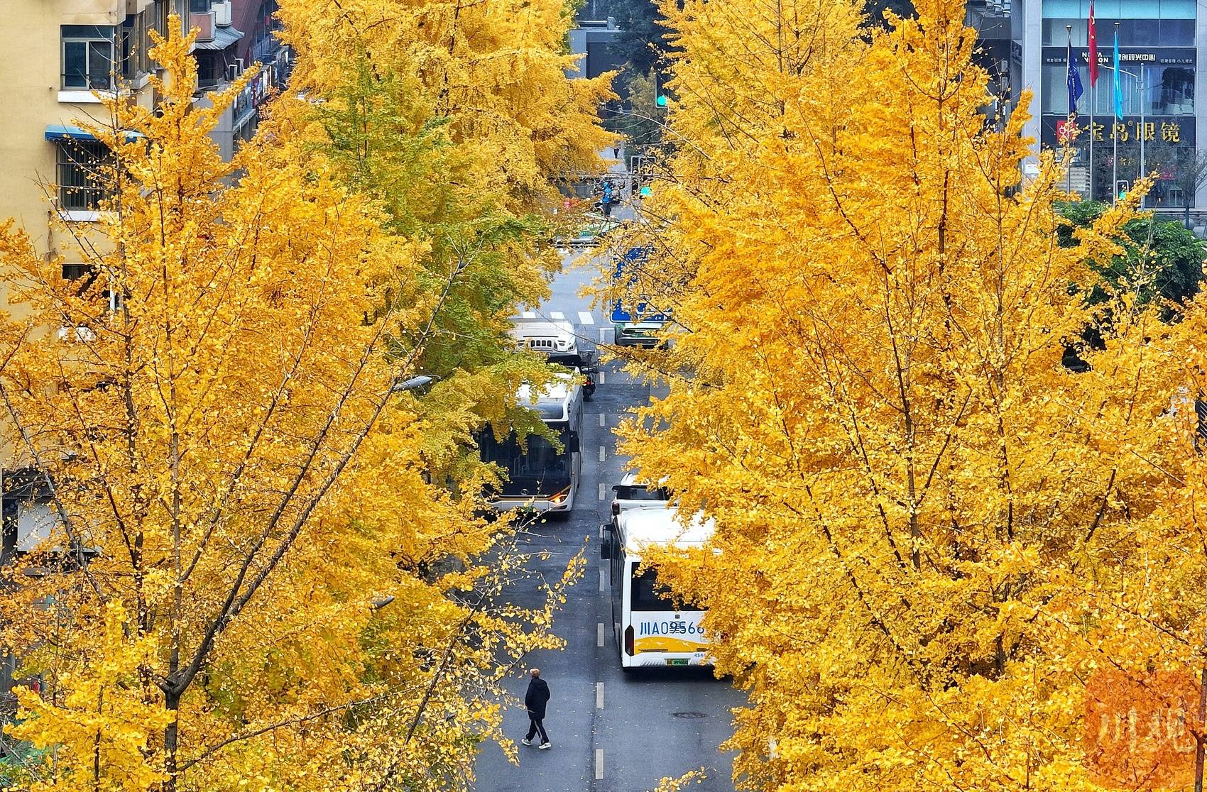 12月12日,尽管近日都是持续的阴天,但成都市区街道金黄色的银杏,为这座城市平添了几分冬日浪漫。