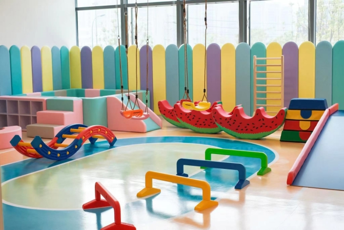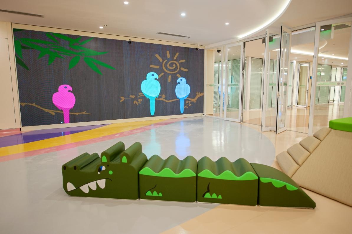 四川大学华西第二医院高新妇女儿童医院以“花园式”理念打造,着力打造温馨、舒适的就医环境。在儿童保健/发育行为中心,有儿童行为发育互动治愈影像墙、动物卡通形象墙绘等充满童趣的设计。这里还设置了儿童游乐设施、亲子阅读角和健康知识展览区,孩子们可以在这里进行互动游戏、平衡训练和社交行为训练。这些设计是为了帮助儿童改善平衡感、协调性、触觉等感官处理能力,促进他们早期发展。医院希望通过这些充满人文关怀的设计,让小朋友们在更加轻松、愉快的氛围中接受治疗,更好地促进他们的身心健康。