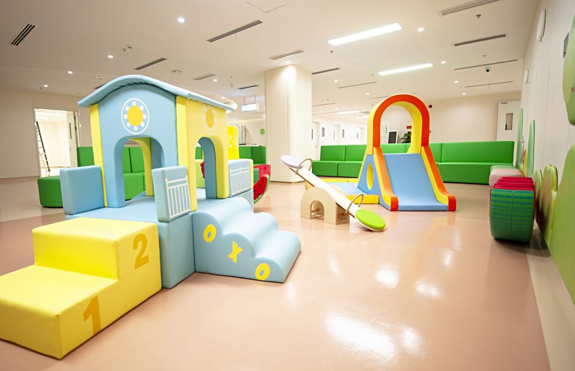 色彩丰富鲜艳的活动游戏区,无疑是孩子们嬉戏玩乐的极佳场所,滑滑梯、跷跷板、洞洞屋等游乐设施为孩子们提供了欢快的娱乐时光,也让家长在等候过程中得以轻松照看。这些设施在设计时,充分考虑儿童安全、健康和发展需求,为孩子们营造出一个快乐、安全、和谐的就诊环境。