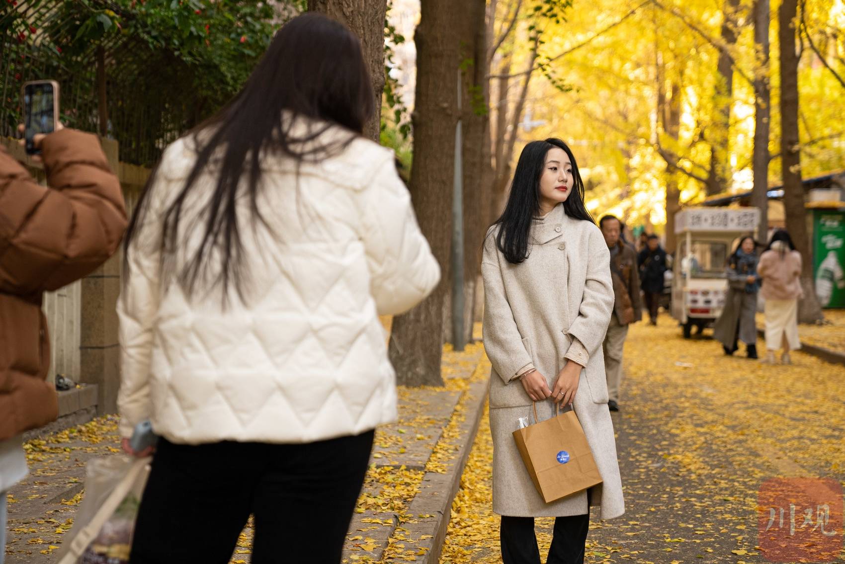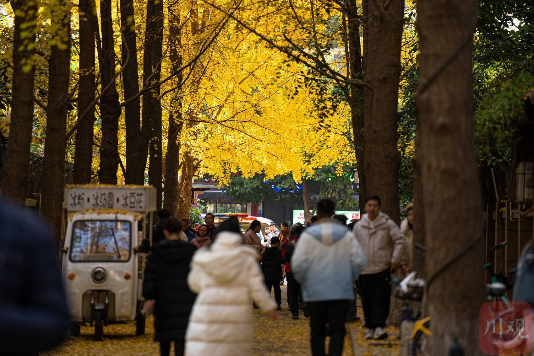 游客和市民们纷纷涌向这里,他们或独自欣赏,或结伴而行,用相机、手机记录下这份难得的美丽。锦绣巷的银杏树栽种密集,初冬时节变得金黄灿烂,成为了成都市区内一道亮丽的风景线,也为市民和游客们带来了冬日的美好回忆。