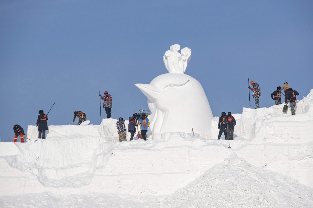12月20日,在哈尔滨太阳岛雪博会园区,雪雕雕刻师在创作本届雪博会主塑《雪艳春》。