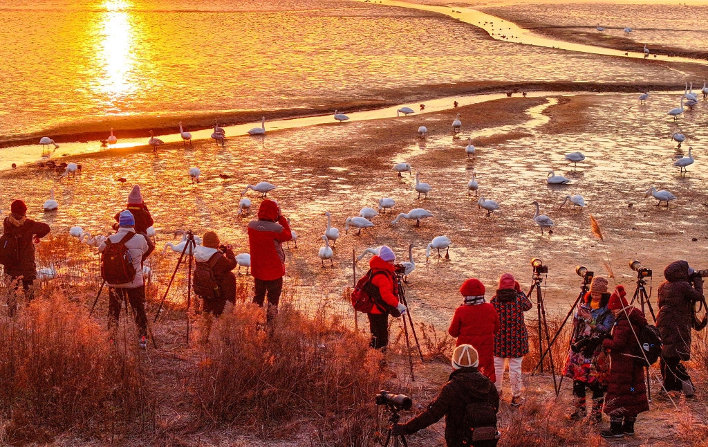 12月20日,在山东省荣成市天鹅湖湿地摄影区,摄影爱好者在拍摄大天鹅。