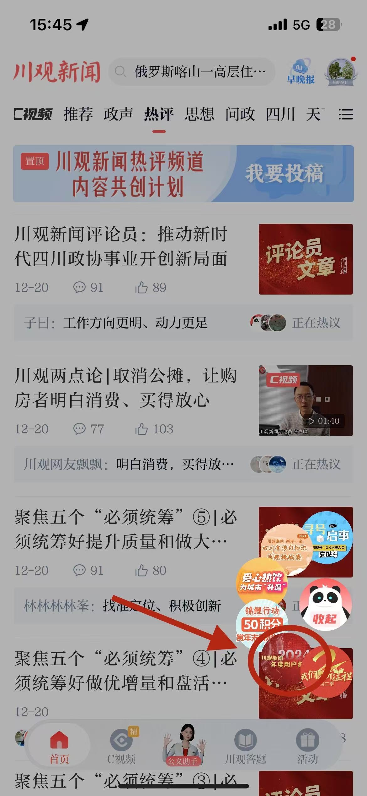3、在川观新闻首页,点击右下方悬浮球,找到“川观新闻2024年用户年度报告”活动图片,点击参与活动即可参与;