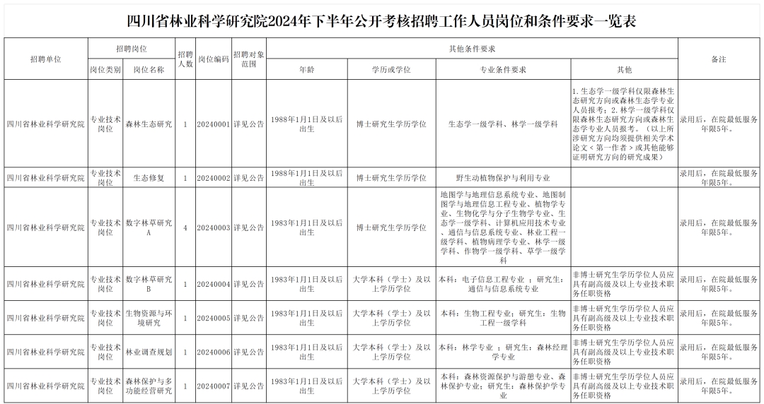 面向全国公开考核招聘符合《四川省林业科学研究院2024年下半年公开考核招聘工作人员岗位和条件要求一览表》(以下简称《岗位和条件要求一览表》。