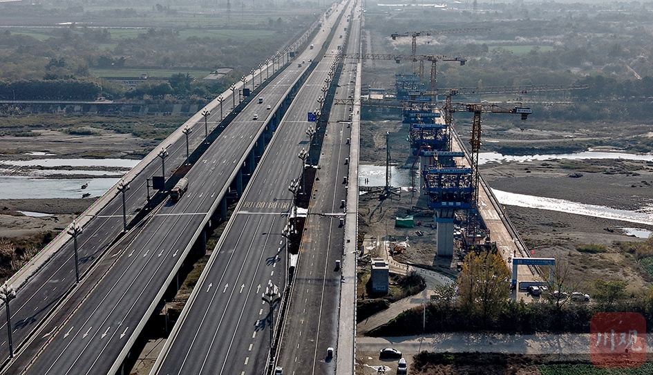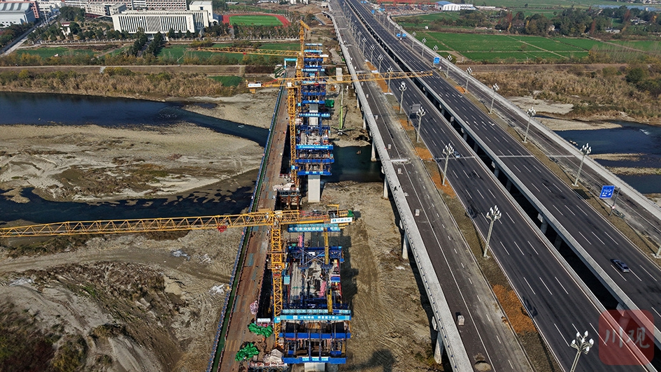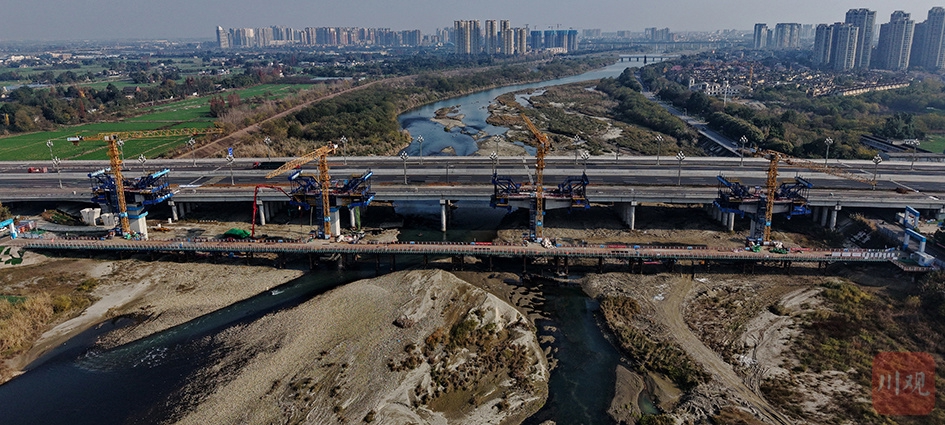 临近岁末,在天府大道旁,成都市域铁路S11线德阳段广汉鸭子河大桥正在进行高架施工。