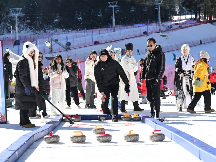 12月27日,在汶川县羌人谷滑雪场,游客体验雪地冰壶项目。新华社记者 王曦 摄