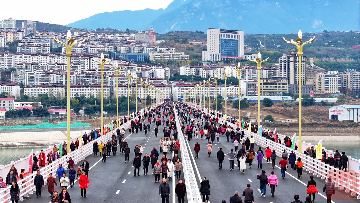 汉源市民来到大桥上,一同“踩桥”庆祝大桥开通。C视觉 崔心怡 摄
