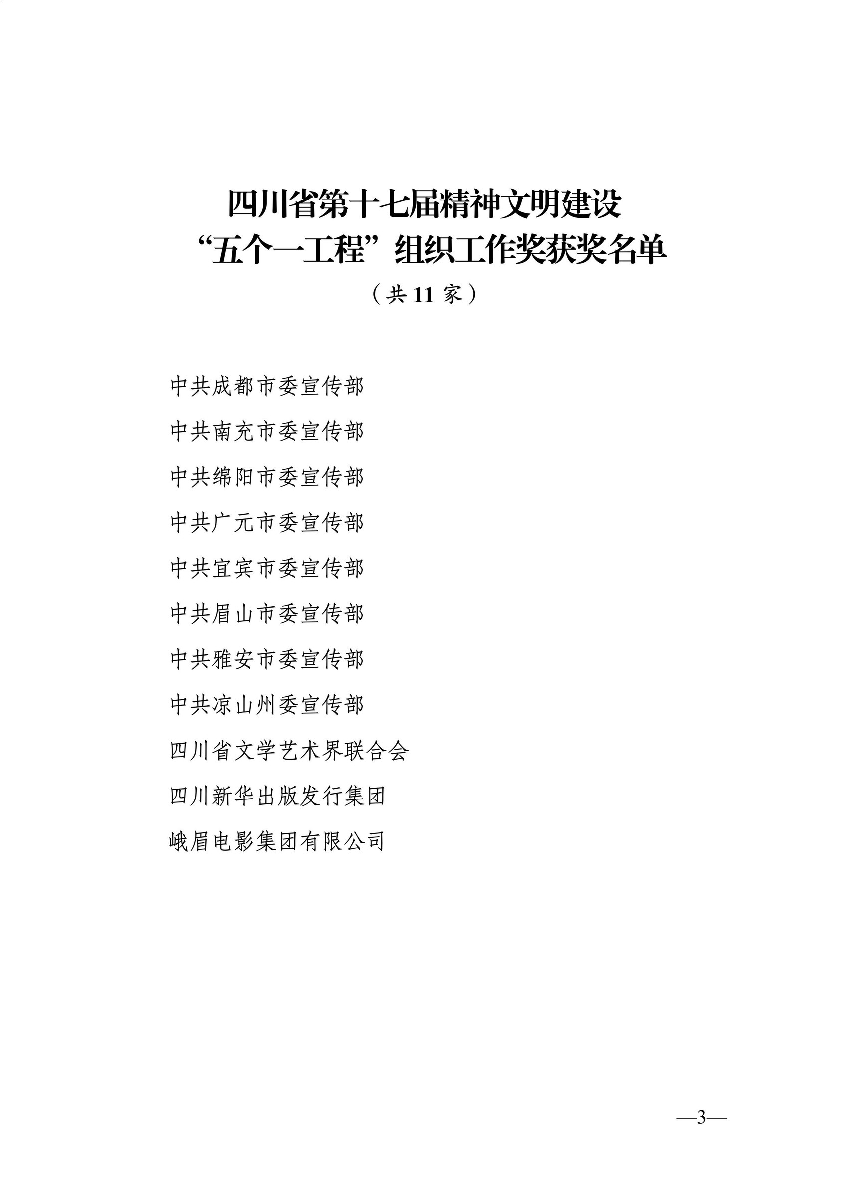 近日,中共四川省委宣传部《关于表彰四川省第十七届精神文明建设‘五个一工程’组织工作先进单位和优秀作品的决定》,对先进单位和优秀作品进行表彰。