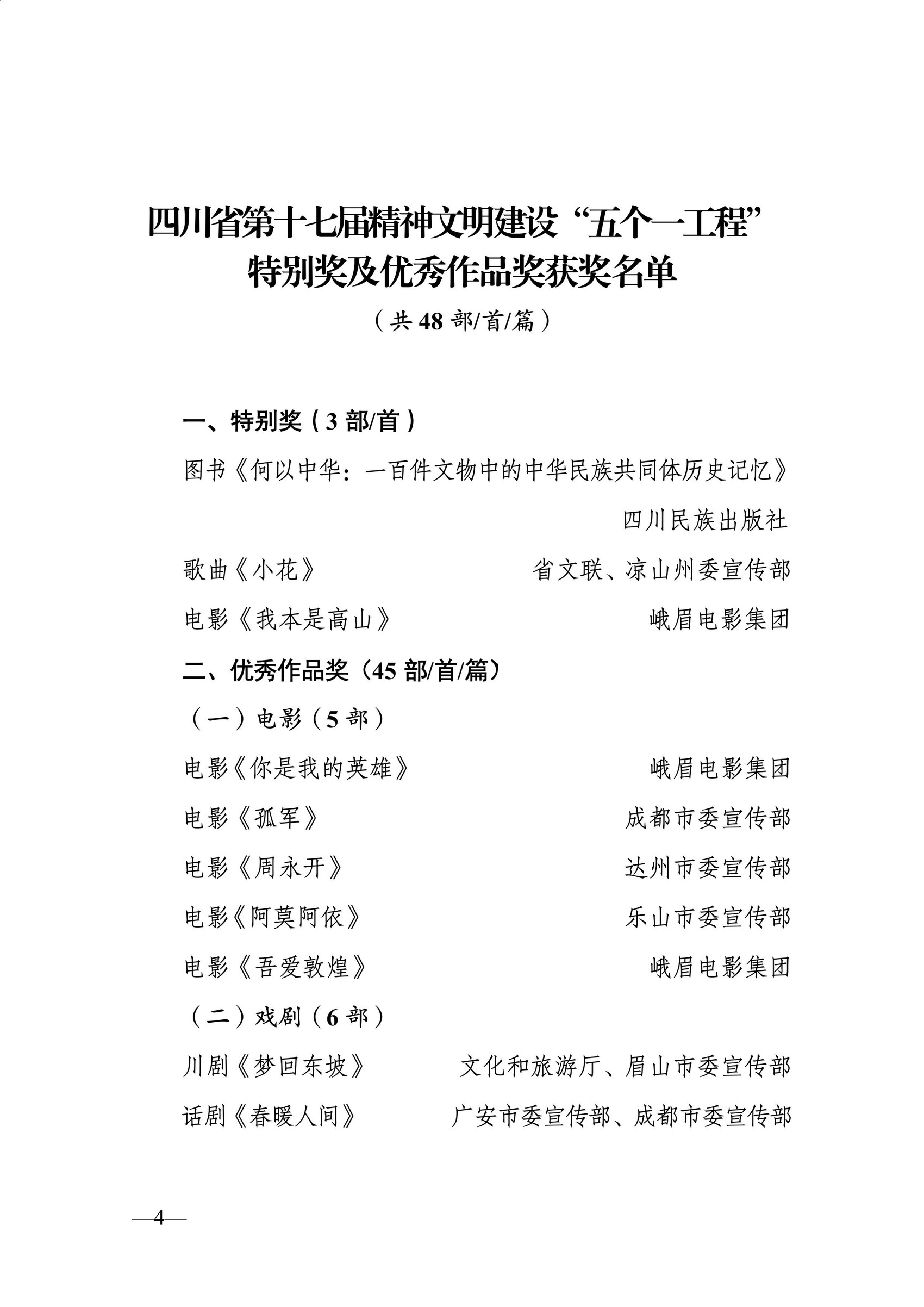 图书《何以中华:一百件文物中的中华民族共同体历史记忆》、歌曲《小花》、电影《我本是高山》3部(首)作品获四川省第十七届精神文明建设“五个一工程”特别奖。