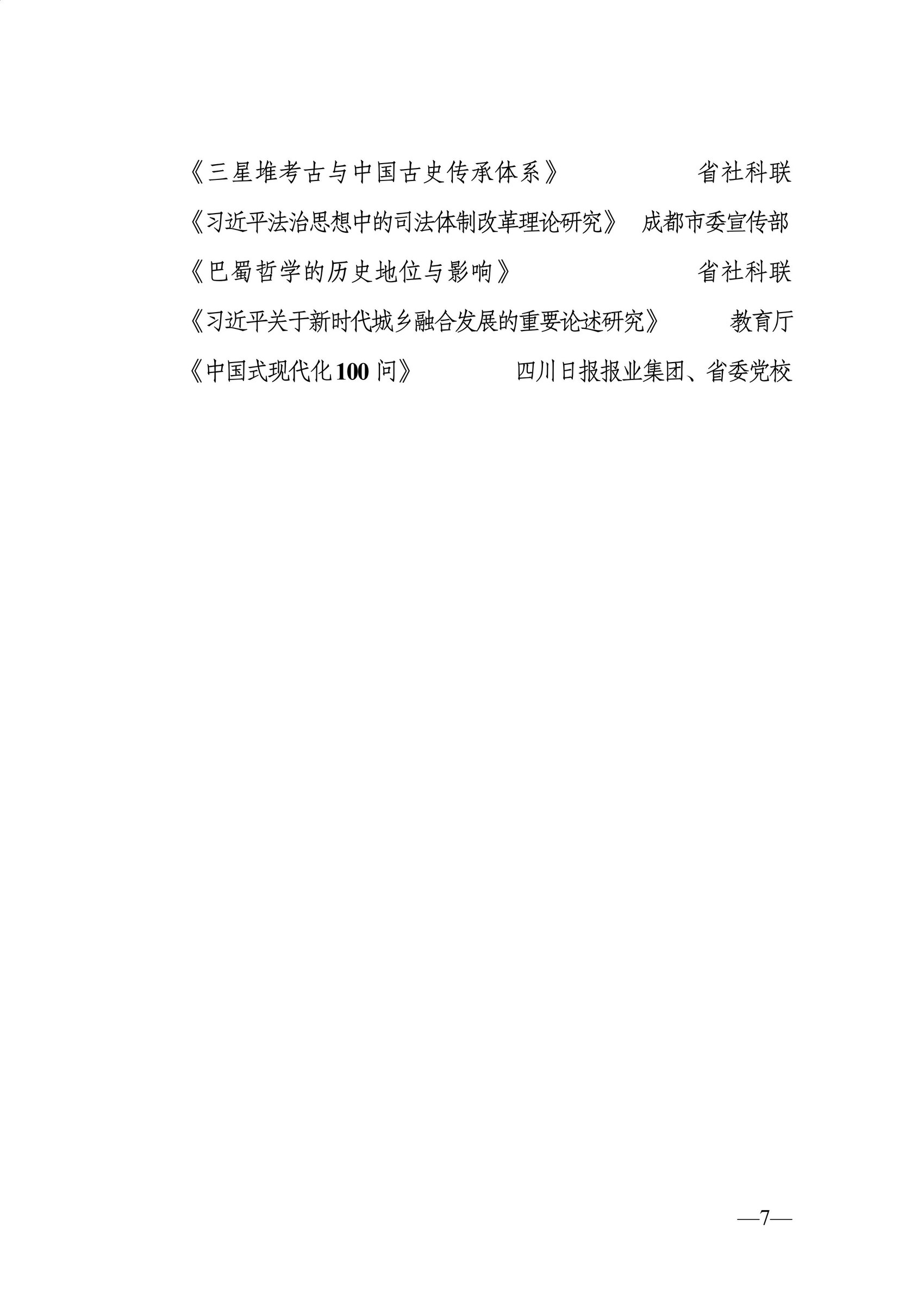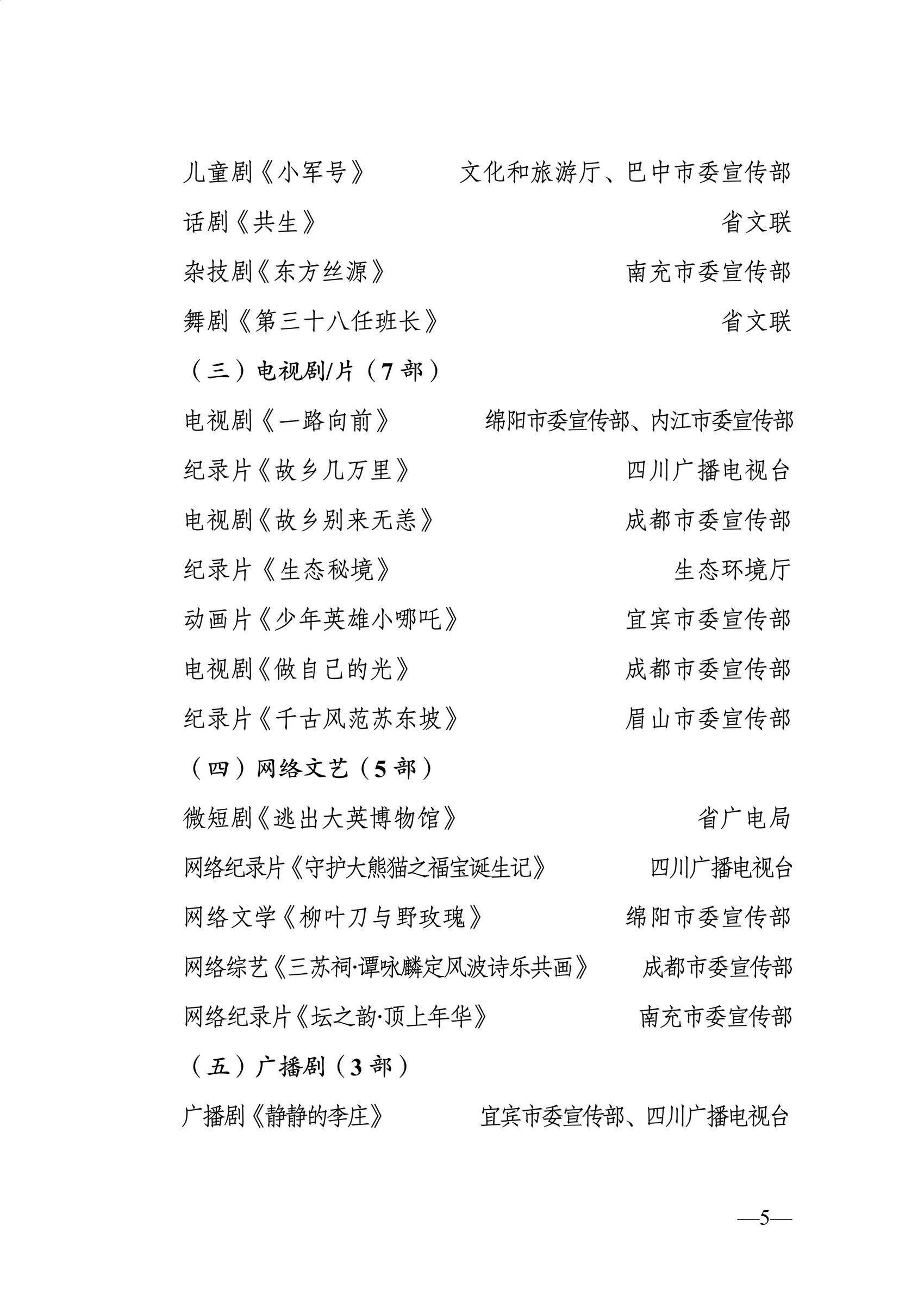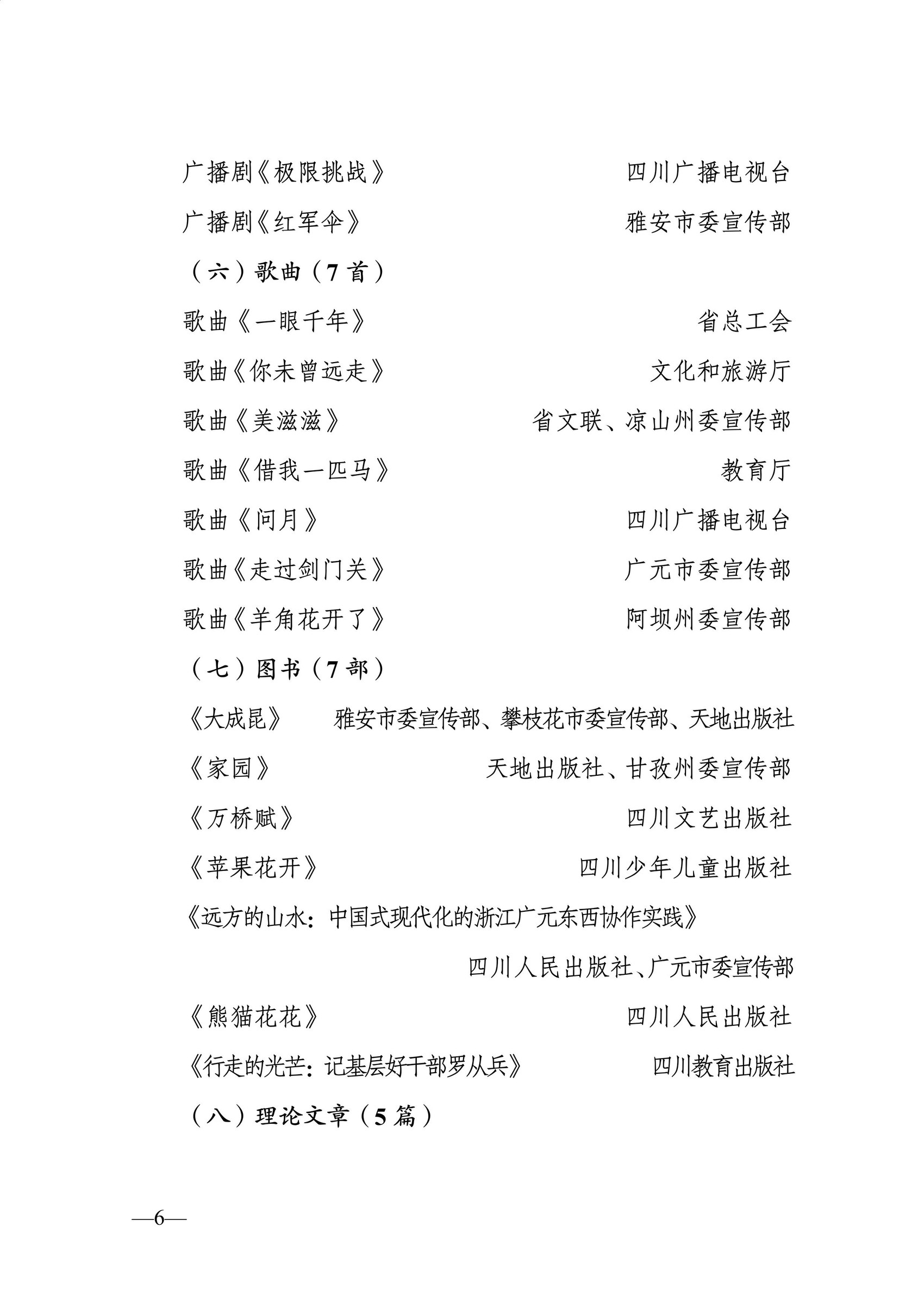 《你是我的英雄》等5部电影作品、川剧《梦回东坡》等6部戏剧作品、《一路向前》等7部电视剧/片作品、微短剧《逃出大英博物馆》等5部网络文艺作品、《静静的李庄》等3部广播剧作品、《一眼千年》等7首歌曲作品、《大成昆》等7部图书、《三星堆考古与中国古史传承体系》等5篇理论文章获四川省第十七届精神文明建设“五个一工程”优秀作品奖。