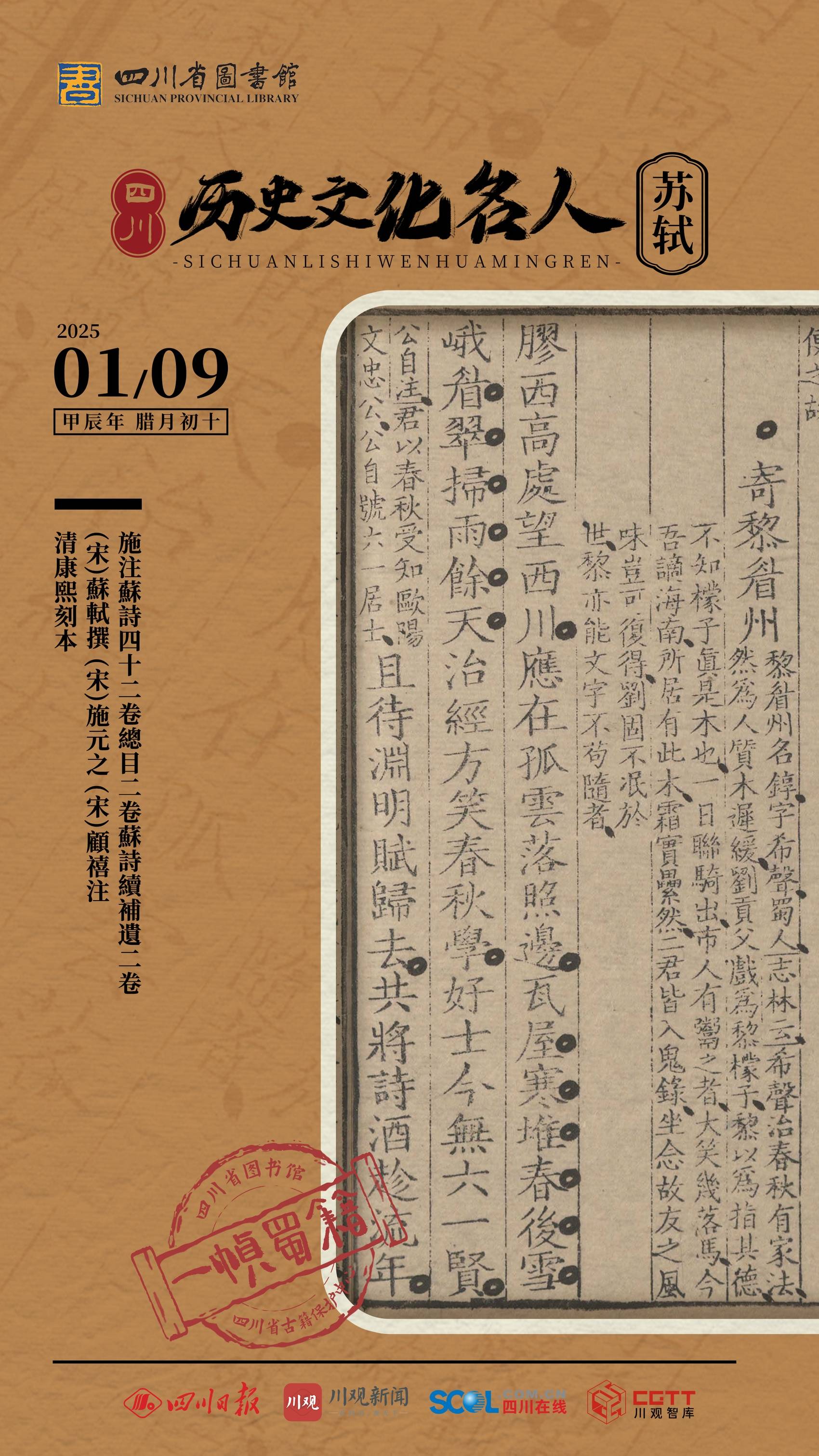 1月9日,一帧蜀籍邀您欣赏《施注苏诗》。海报所选用图为《施注苏诗》四十二卷总目二卷苏诗续补遗二卷,由(宋)苏轼撰,(宋)施元之、顾禧注,清康熙刻本。