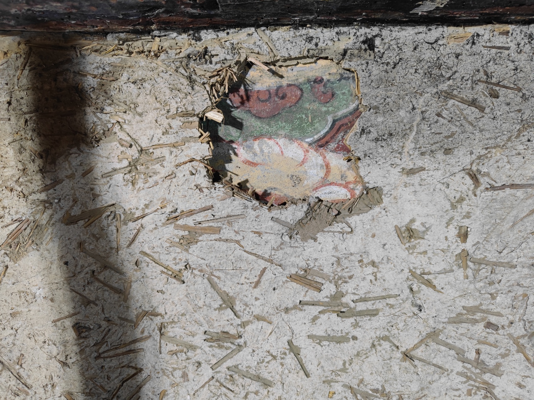 手电筒的光线直指自建墙壁斜后方的大殿墙壁。在层层石灰的掩盖下,一些黑色的水墨线条隐约可见。这些清代的水墨壁画上附着了较为随意的石灰擦痕,需进一步清理。“石灰其实是一种非常难清理的杂质。它质地较为坚硬顽固,需要我们更加缓慢、细致地进行操作。”看到现场的实际情况,李晓洋清楚,壁画需要揭取下来进行修复,而其墙面的竹编载体历经百年也早已破败不堪,需要将糟朽的竹编墙拆除后进行重新编制,以达到回帖(将壁画贴回墙壁)的强度要求。不过,不久后的一个发现,彻底改变了此次的壁画修复计划。