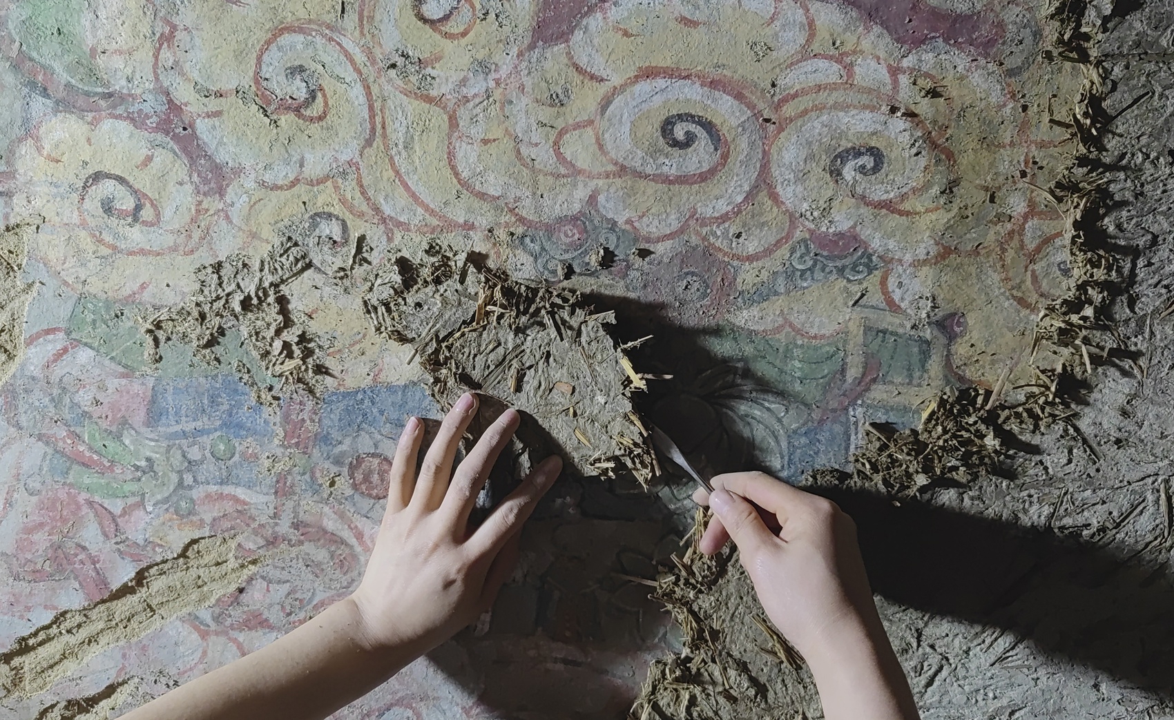 揭开竹篾,明代壁画的祥云图案出现在修复师视野内。