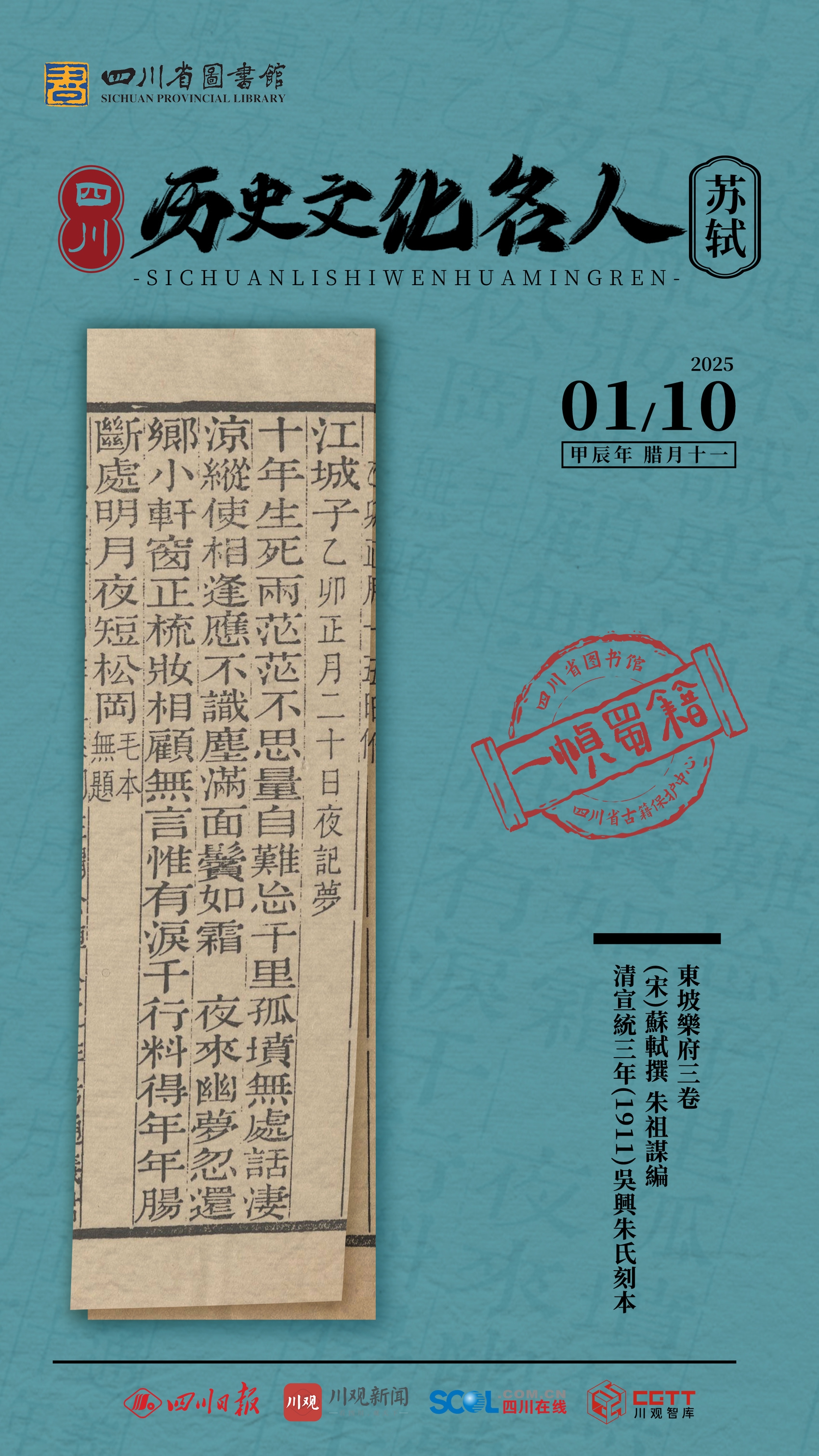 1月10日,一帧蜀籍邀您欣赏《东坡乐府》。海报所选用图为《东坡乐府》三卷,由(宋)苏轼撰、朱祖谋编,清宣统三年(1911)吴兴朱氏刻本。