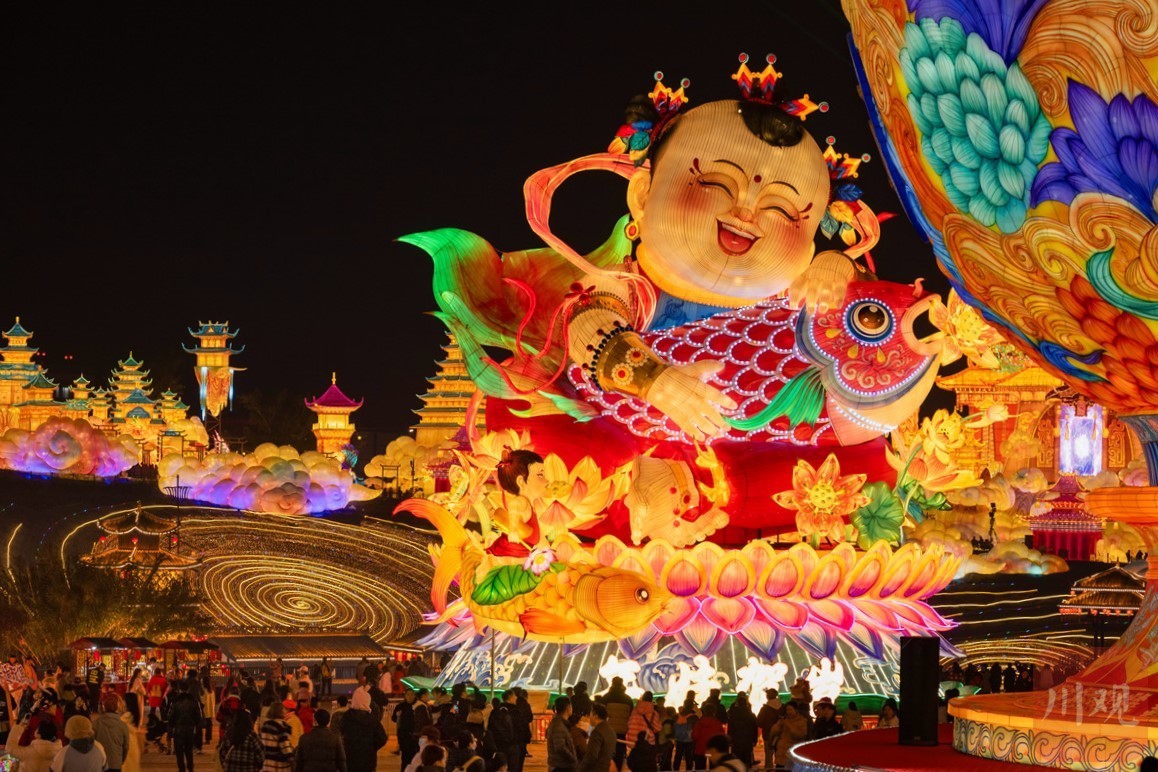 本届灯会融入瓷器、川戏、炫彩、吹塑、剪纸等非遗技艺,推出了“喜气盈门” “五谷丰登” “年年有余”等特材灯组。表现了自贡彩灯独有的精湛工艺。