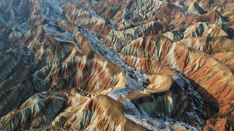 冬日,在甘肃省兰州市永登县树屏镇的兰州水墨丹霞景区,起伏绵延的山体在白雪的映衬下层理交错,更显瑰丽多姿。