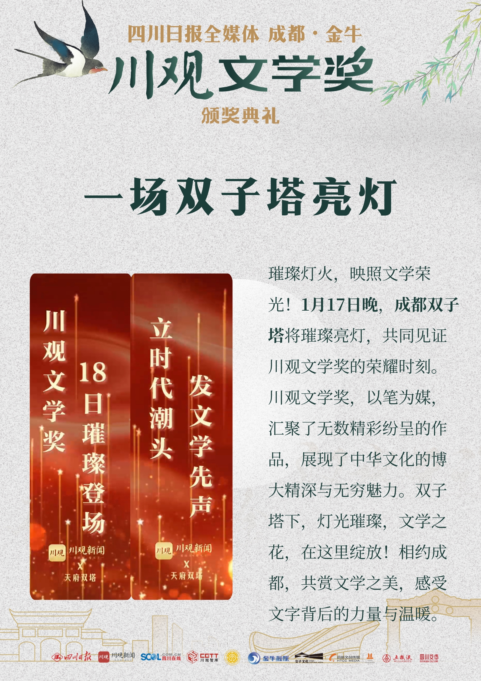 “立时代潮头,发文学先声”“绽放理想光芒,凝聚前行力量”“川观文学奖18日璀璨登场”……1月17日晚6时30分,随着成都金融城双子塔为川观文学奖点亮灯光,2023年度川观文学奖颁奖典礼系列活动正式启幕。本次活动由四川日报社主办,川观新闻、成都市文联协办,川观新闻文化频道、金牛区文联、金牛区融媒体中心、金牛城投集团交子文化公司、五粮液、成都高新文创传媒有限公司、四川文化传播有限公司承办。