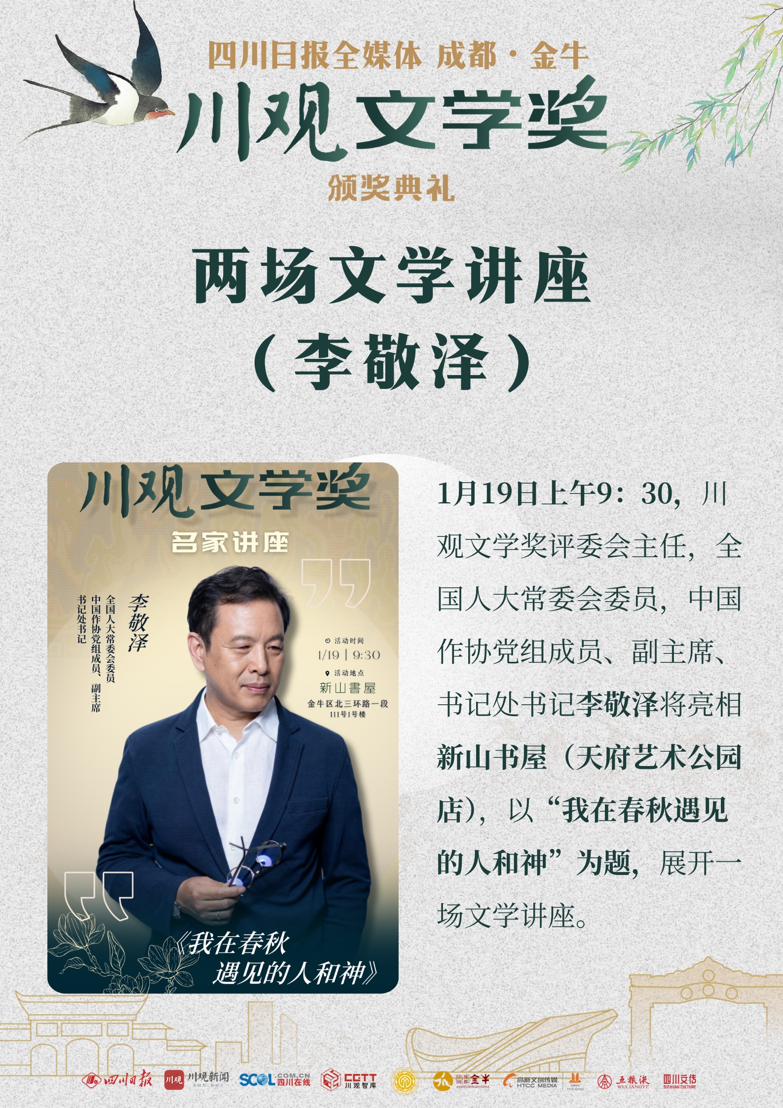 文学讲座方面,1月18日上午10时,中国作协全委会委员、中国报告文学学会会长徐剑将亮相成都市金牛区图书馆,以《行走的无限与文学的边界》为题,为听众带来一场精彩的讲座;1月19日上午9时30分,在新山书屋(天府艺术公园店),中国作协副主席、书记处书记李敬泽将以《我在春秋遇见的人和神》为题开讲,围绕2024年出版的同名历史随笔集,分享创作点滴。