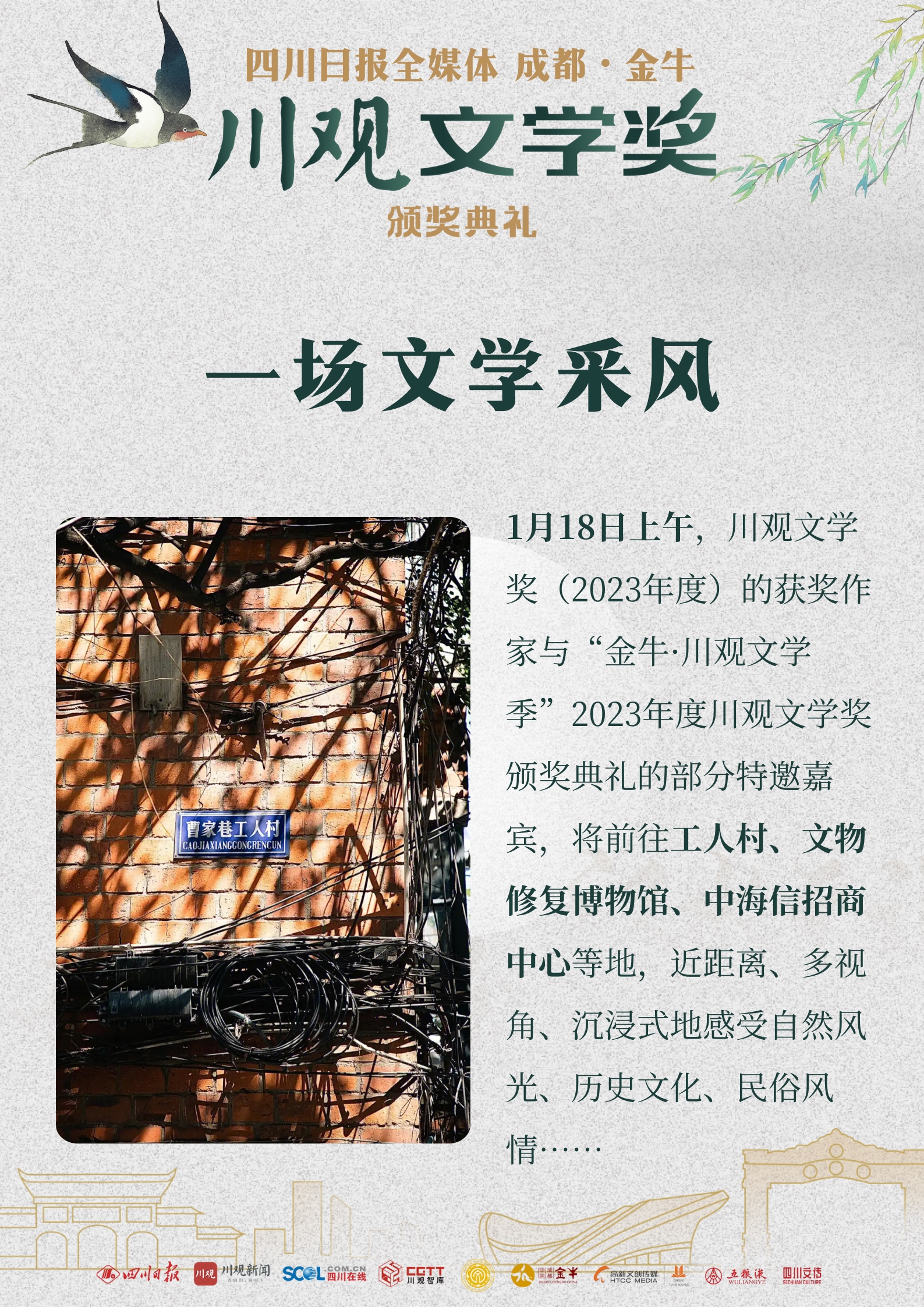 这场文学盛宴,既有思想与观点的交流碰撞,也有深入街头巷尾的行走探访。文学采风方面,1月18日上午,嘉宾们将前往成都市金牛区,深度探访工人村、中海信招商中心等点位,近距离、多视角、沉浸式地感受成都城市深厚的历史人文积淀,以及经济社会发展的万千气象,为创作激发灵感、汲取养分。