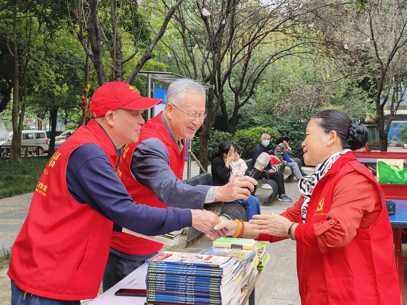 图为2023年11月11日,欧鹏(中)和社区老党员们在社区开展“共沐书香 乐享太平”公益捐书活动
