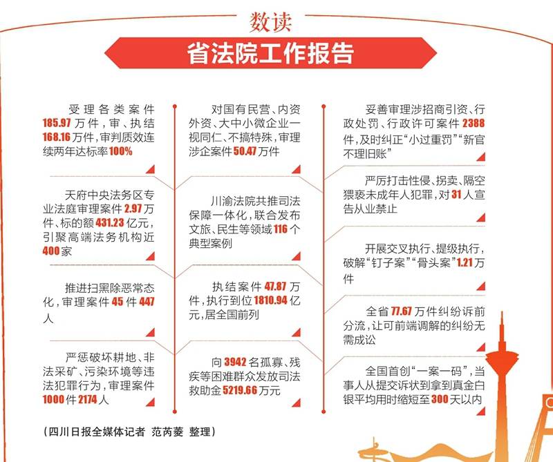 四川省高级人民法院工作报告指出,2024年,全省法院切实以审判工作现代化支撑和服务四川现代化建设,共受理各类案件185.97万件,审、执结168.16万件,审判质效连续两年达标率100%,稳居全国第一方阵。2025年,将坚持守正创新、拓优增信,努力让人民群众在每一个司法案件中感受到公平正义。