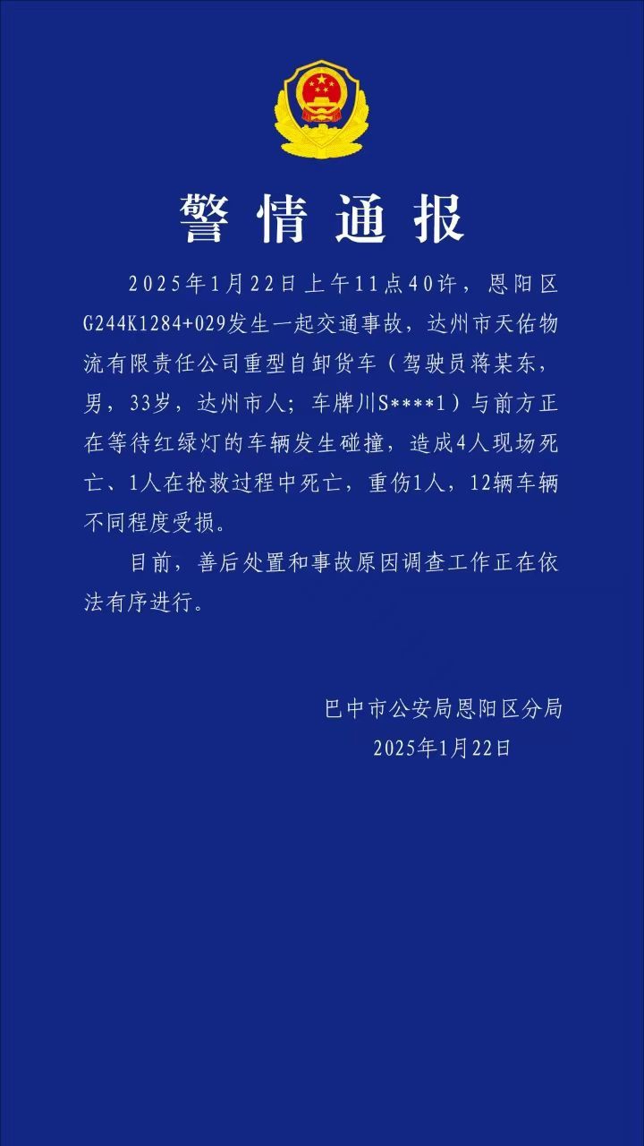 1月22日上午,巴中市恩阳区发生一起交通事故,造成4人现场死亡、1人在抢救过程中死亡,重伤1人、12辆车辆不同程度受损。具体通报如下:
