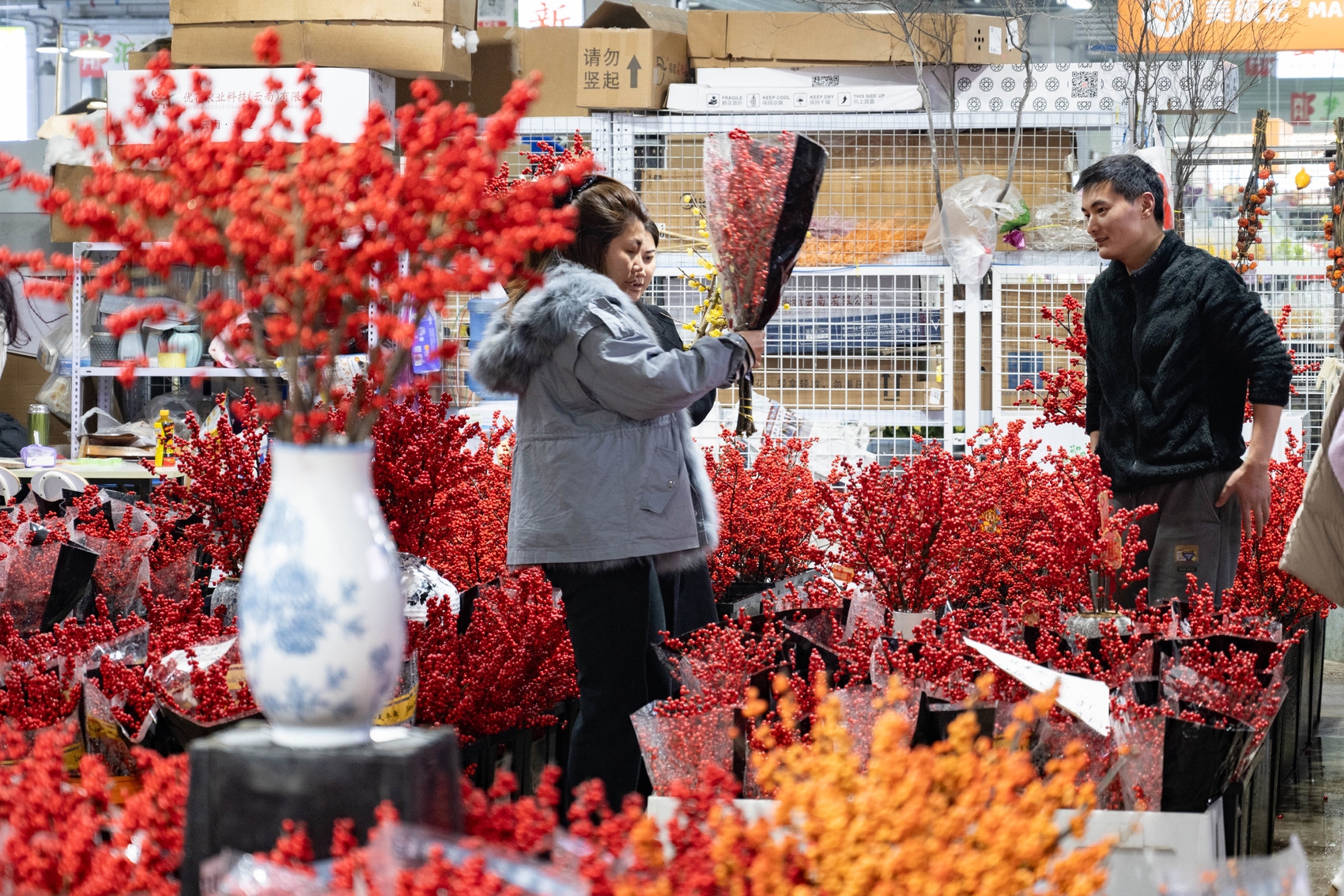 1月23日是南方“小年”,位于成都市龙泉驿区的卉升花市人头攒动。这里是全川最大的鲜切花批发市场,不少市民在此选购年宵花迎新年。