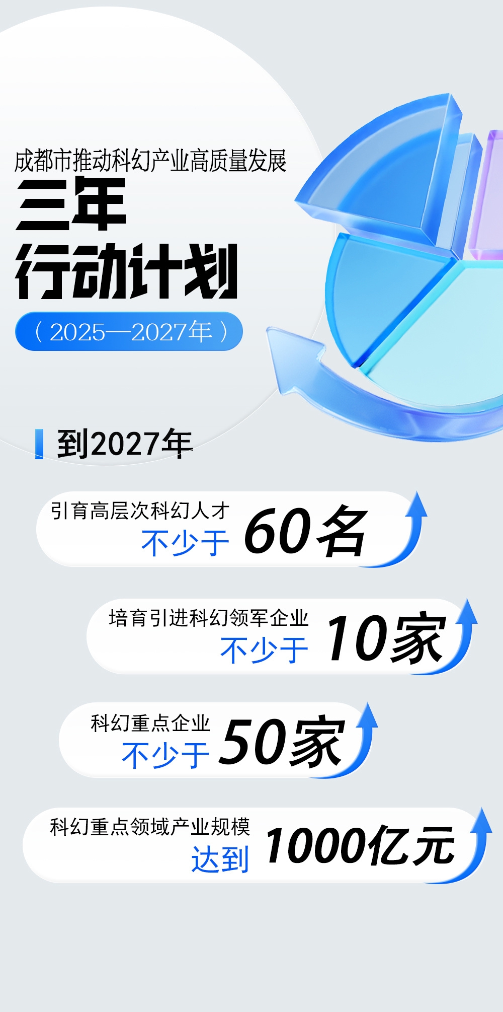 具体看,到2027年,成都科幻产业综合实力稳步增强,引育高层次科幻人才不少于60名,培育引进科幻领军企业不少于10家、科幻重点企业不少于50家,科幻重点领域产业规模达到1000亿元;科幻品牌矩阵扩能提质,“天问”华语科幻文学大赛影响力进一步扩大,举办、承办科幻领域具有全球影响力的会议展览不少于10场;IP培育转化成效突出,推出具有良好社会影响力的优质科幻作品不少于10部;创新策源水平大幅提升,在科幻产业支撑技术领域对标国际水平掌握一批关键核心技术,力争培育国家级专精特新“小巨人”企业60家以上;多元科幻场景加速拓展,高水平打造世界科幻公园,落地具有全球影响力的科幻主题场景不少于5个。