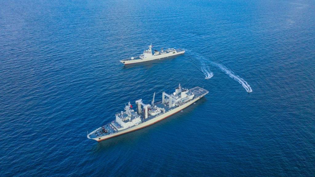 中国海军第46批护航编队组织反恐反海盗演练,舰艇掩护小艇出击(2025年1月2日摄)。