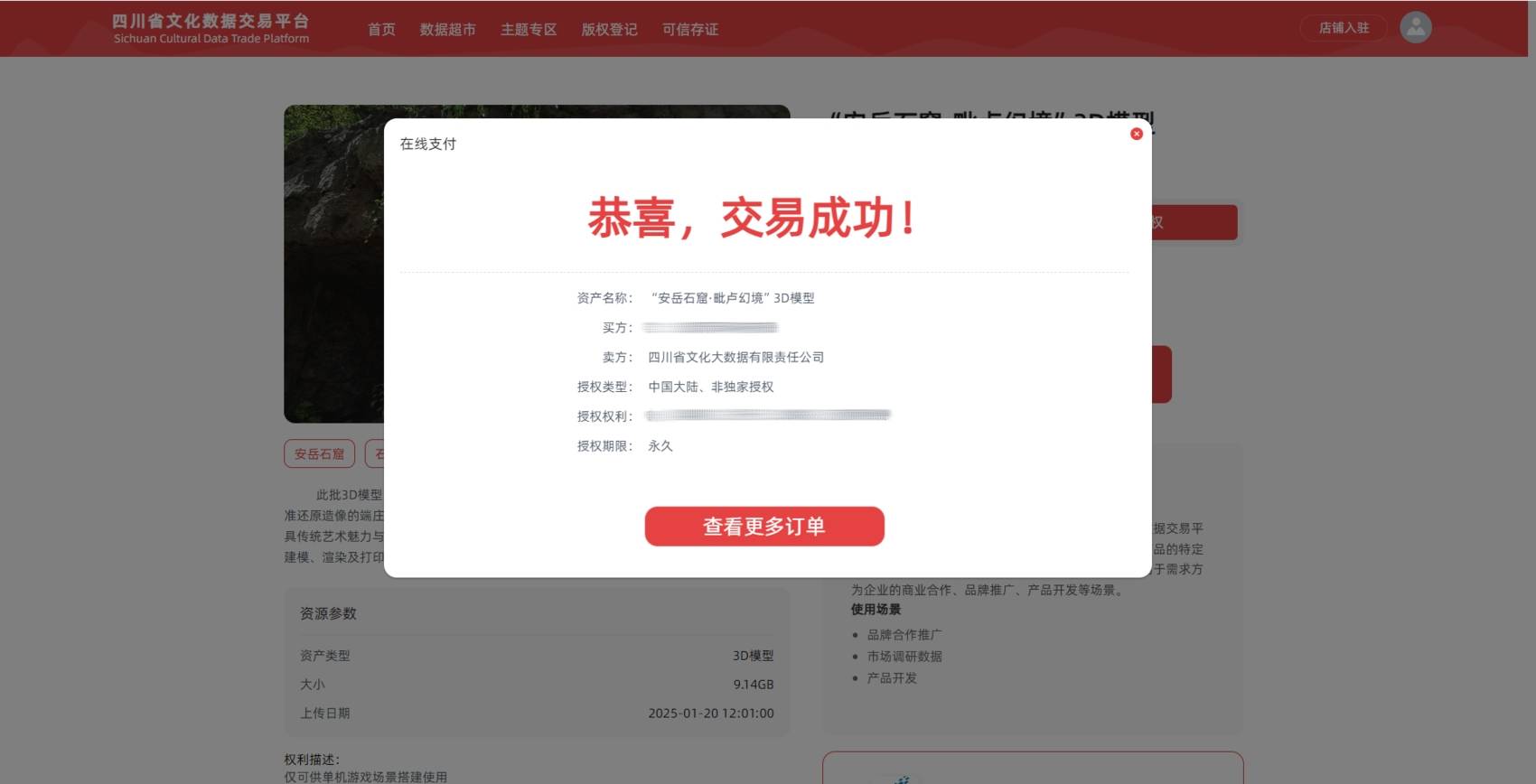 此次交易的文化数据——“安岳石窟·毗卢幻境”3D模型作品,是四川石窟文化旅游开发有限公司在获得安岳石窟研究院授权后,对毗卢洞进行数字化采集并创作的3D模型。模型数据经三级文化数据服务平台关联汇入中华文化数据库,并由四川省文化大数据公司进行代理运营。某游戏公司在四川省文化数据交易平台上采购了此模型作品,计划应用到游戏场景中。