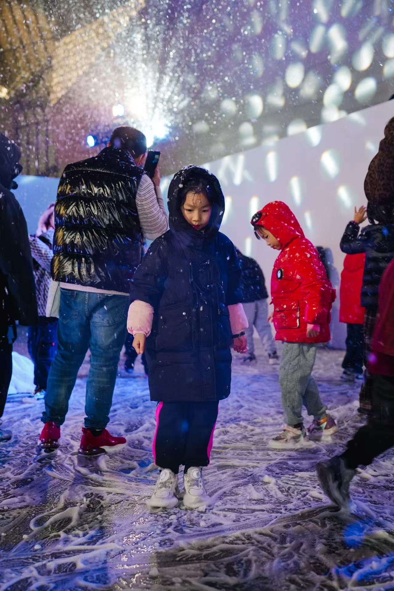 “水去了哪里?”“云朵又藏着怎样的小秘密?”活动中,博物馆工作人员扮演的“雪花精灵”带领小朋友经历季节更迭,层层解密水循环过程,科普暴风雪的形成和危害。主办方还利用灯组、造景、舞美等特效手段,营造了一个个美轮美奂的沉浸式互动体验空间。当片片“雪花”洒落在小朋友的脸颊上时,他们不禁鼓掌欢呼。