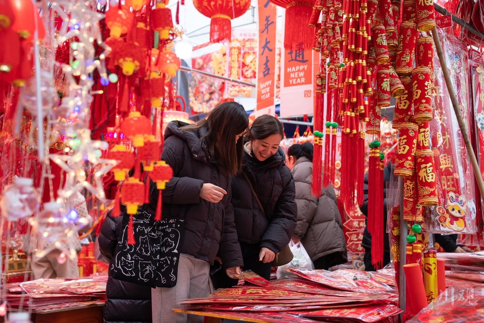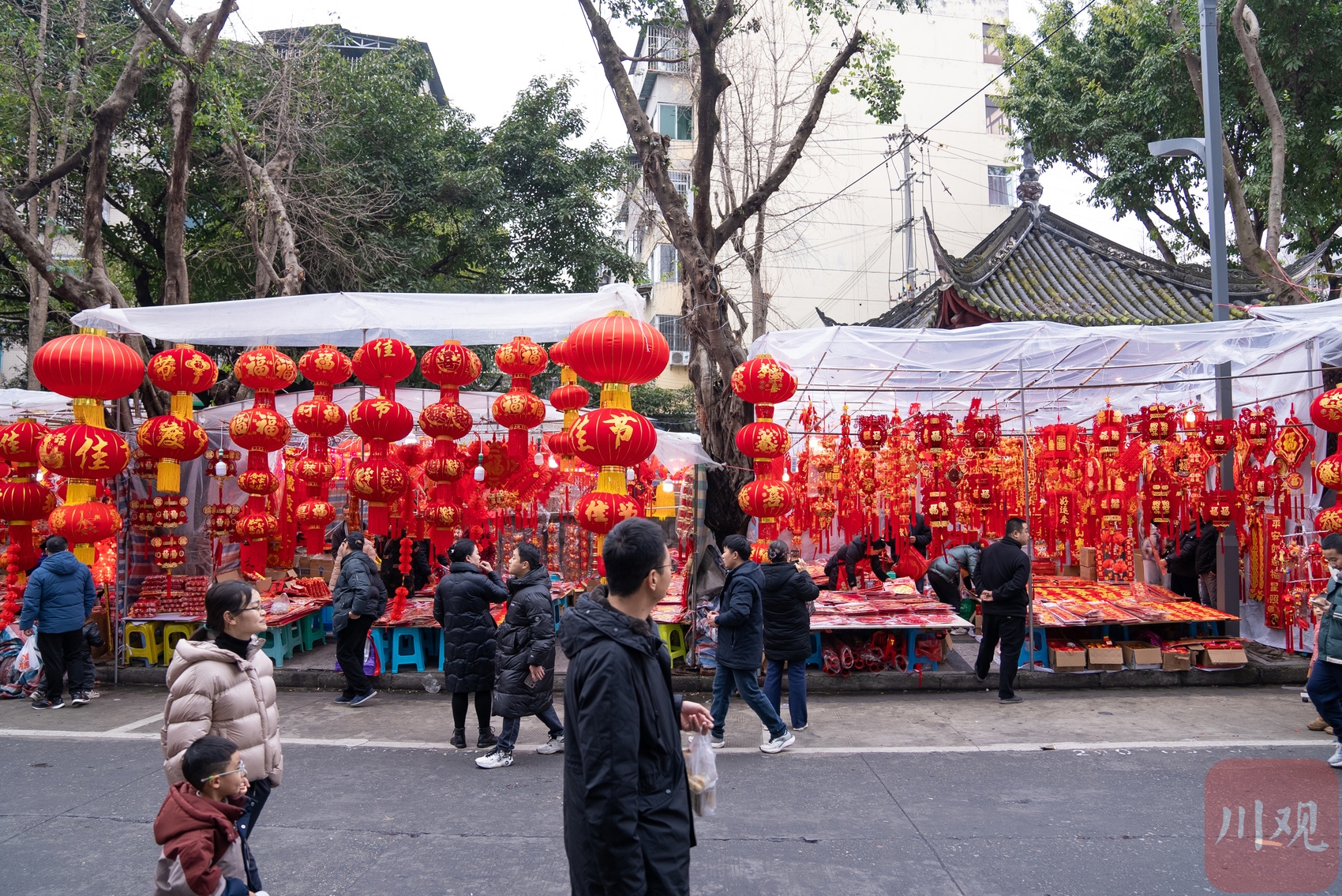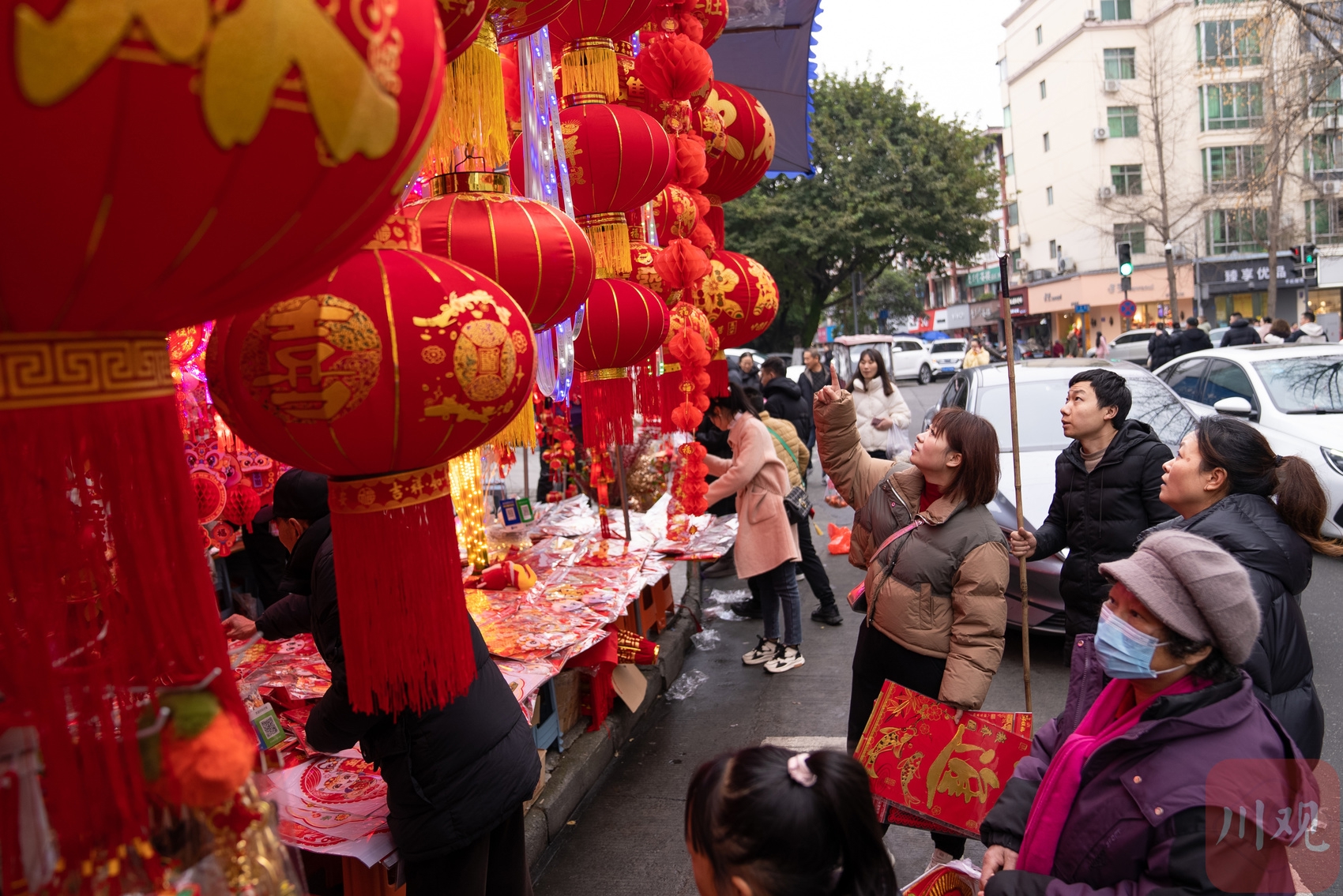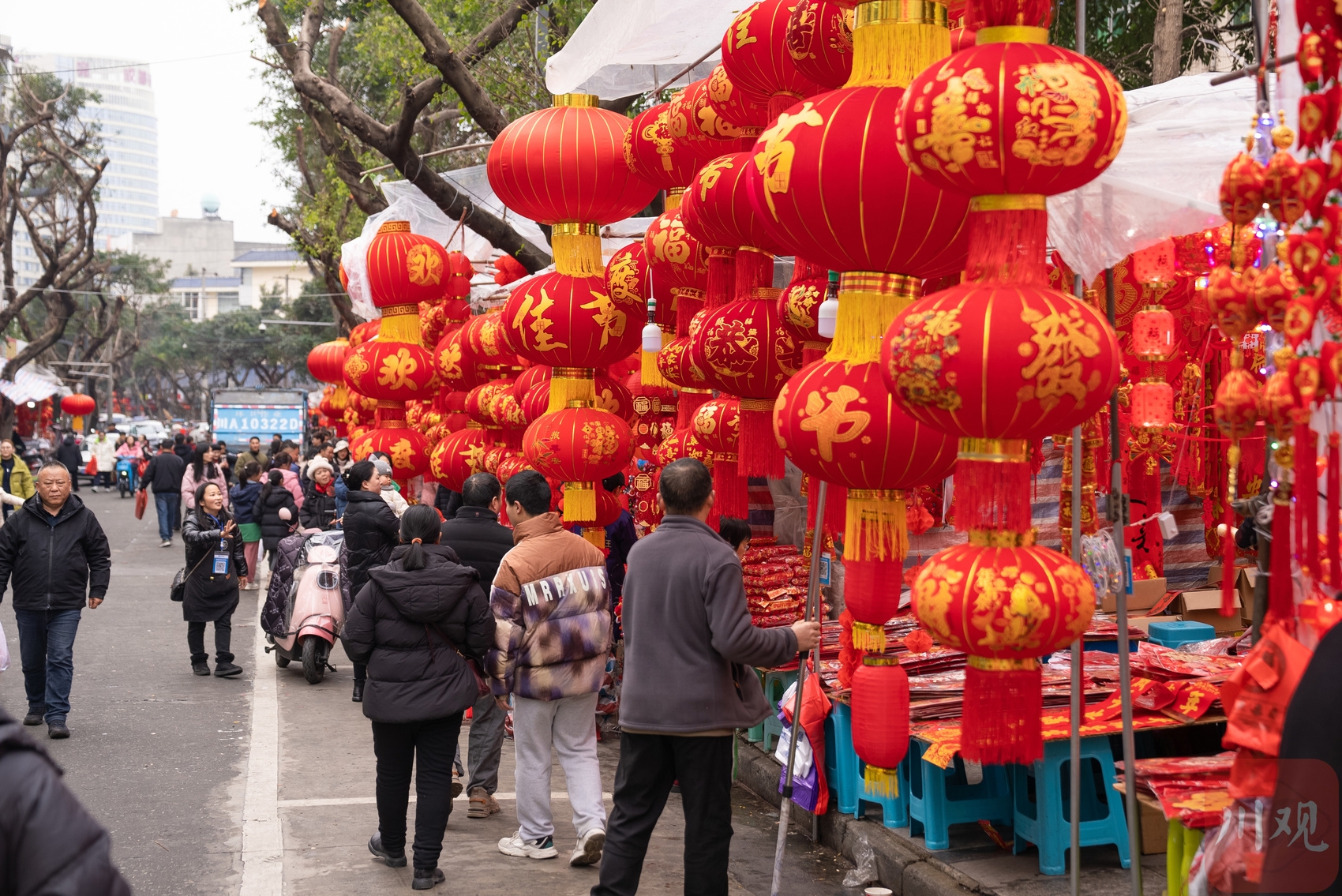 春节将至,成都市温江区温泉路再次焕发出浓厚的节日氛围,变得格外“红火”。1月25日下午,四川在线记者在现场看到,尽管天气寒冷,但丝毫阻挡不住人们购买年货的热情。整条街上人头攒动,热闹非凡,处处洋溢着浓浓的年味。大家在这里忙着挑选红灯笼、春联等各式各样的年货,准备迎接即将到来的新春佳节。