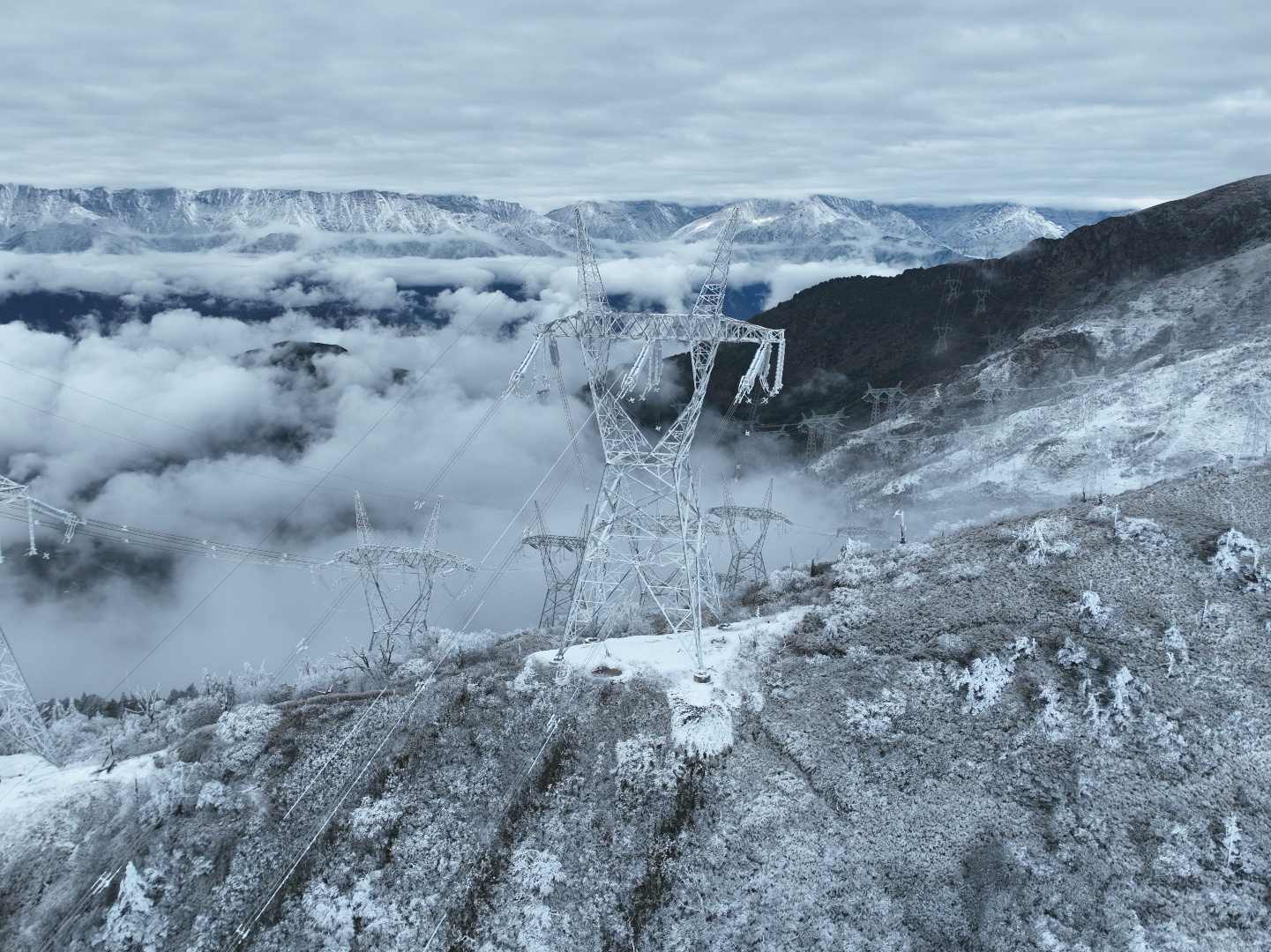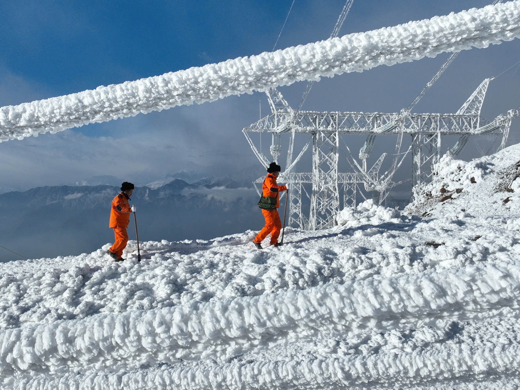 巡线人员观察川渝1000千伏特高压甘天一二线输电线路覆冰情况。