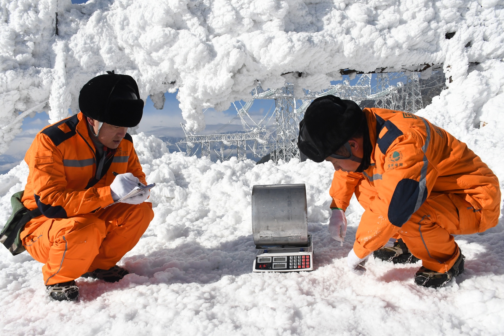 测风、测温度、测湿度……巡线人员立即展开紧张的测量工作。导线上覆盖着厚厚一层雪,“覆冰值是最核心的数据。”潘柱东一边说,一边用冰刀将雪刨开,刮下导线上的覆冰,将覆冰装入取冰桶中,再用电子秤称重,计算覆冰值。