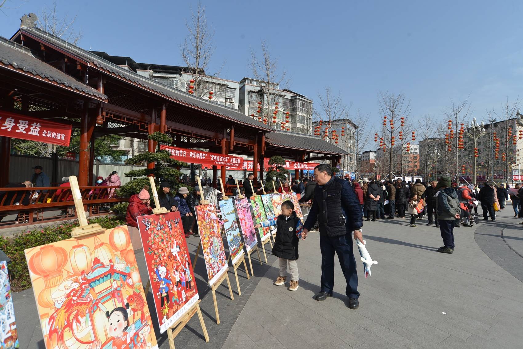 在年画展示区内,集中展出了80余幅年画精品,既有反映传统民俗风情的经典之作,也有展现新时代风貌的创新作品。不少市民游客前来观赏,在色彩鲜艳、寓意吉祥的年画前拍照“打卡”。“通过赏年画活动,小朋友能了解年画背后的文化寓意,以及地方特色文化。”下午三点,展示区前已排起长队。
