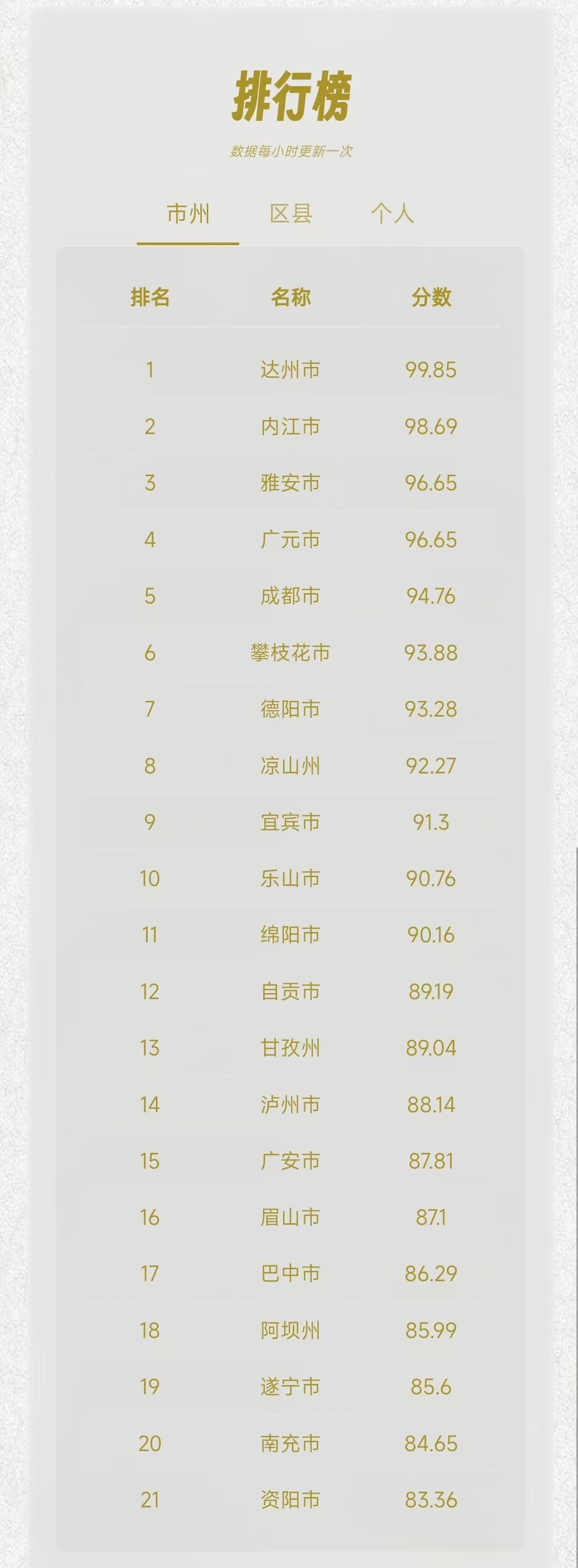 最终,达州市一路领跑,最终斩获市州榜冠军。市州榜上,内江市排名第二,雅安市位列第三,广元市排名第四,成都市位居第五。攀枝花市、德阳市、凉山州、宜宾市、乐山市分列第六到第十位。