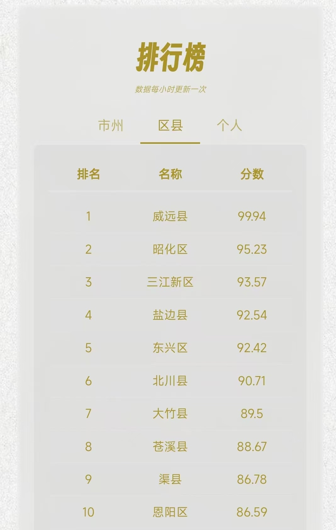 在区县榜上,内江市威远县后来居上,拿下了区县榜第一。区县榜上,广元市昭化区斩获亚军,宜宾三江新区收获第三,攀枝花市盐边县拿到第四,内江市东兴区位居第五。此外,绵阳市北川县、达州市大竹县、广元市苍溪县、达州市渠县和巴中市恩阳区分获第六到第十位。
