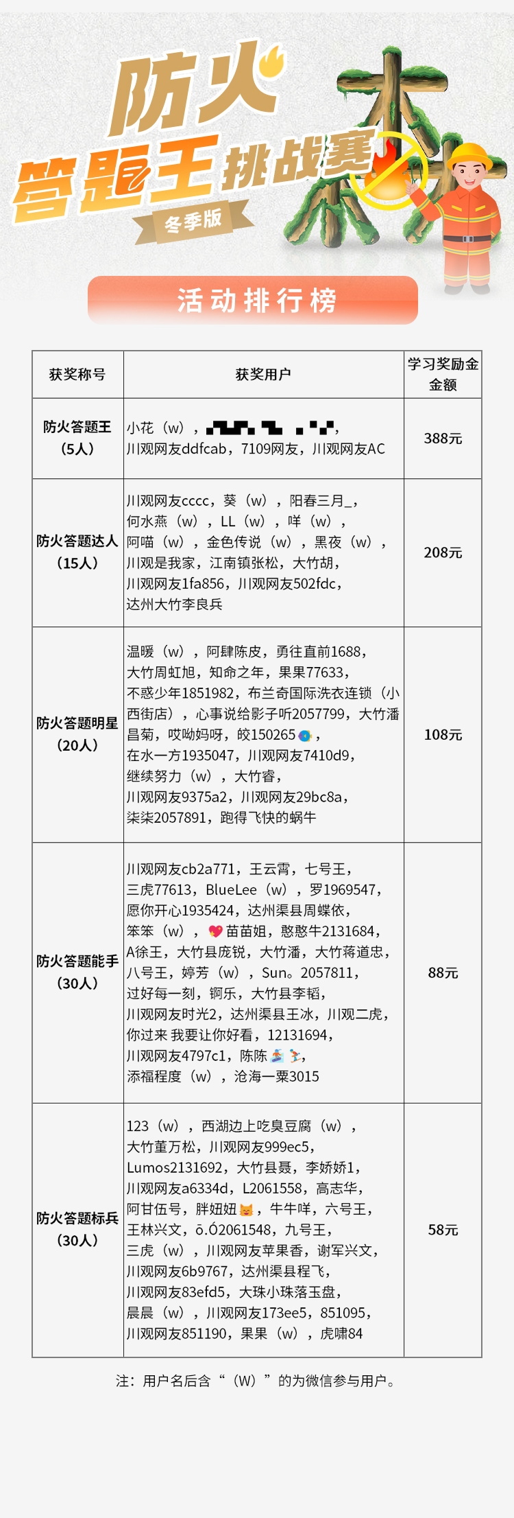 按照活动规则,排行榜前5名并列为“防火答题王”,均可获得388元学习奖励金。