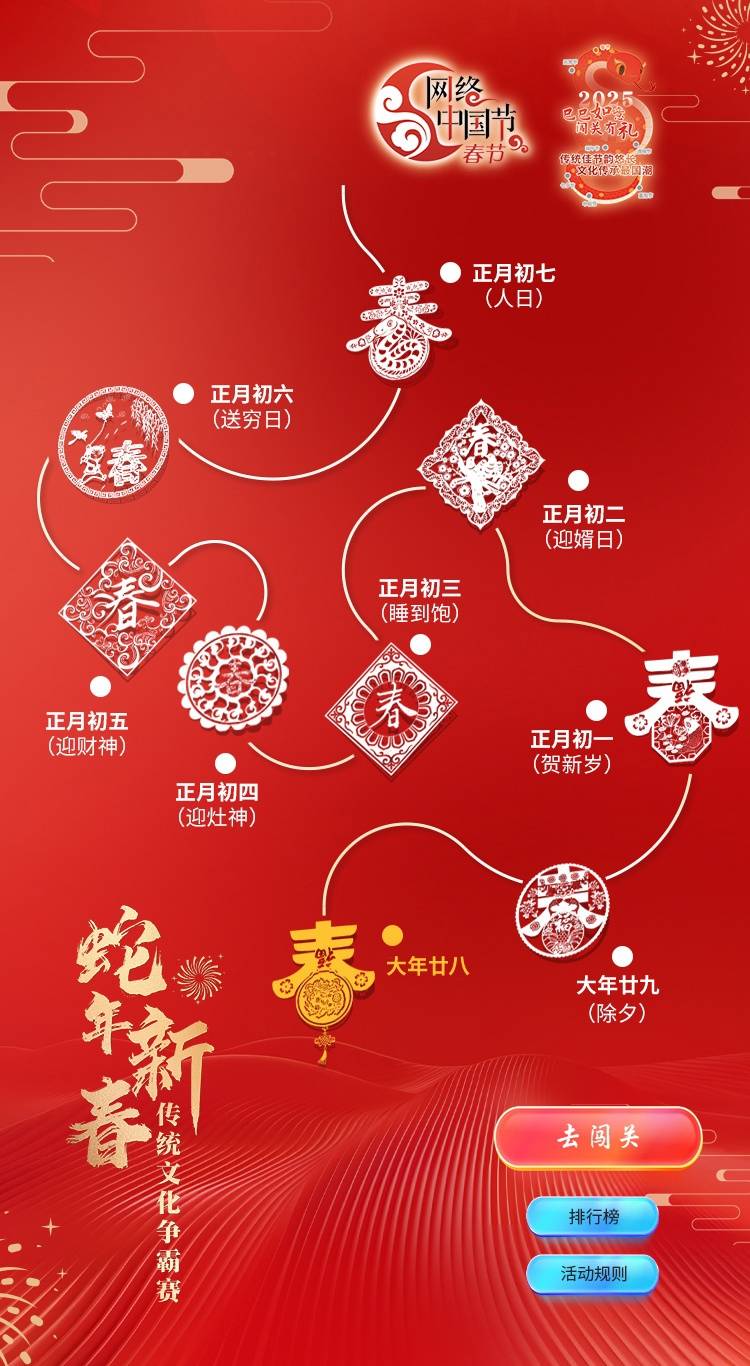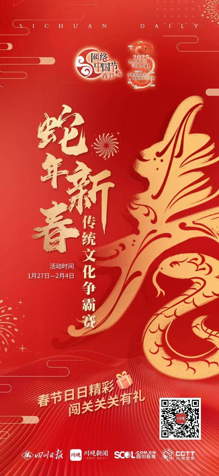 PS,本次“蛇年新春传统文化争霸赛”活动积分将按比例计入2025年“网络中国节”“巳巳如意闯关有礼”活动总排行榜。重阳节活动结束后,总排行榜排位靠前的用户还将获得额外奖励。