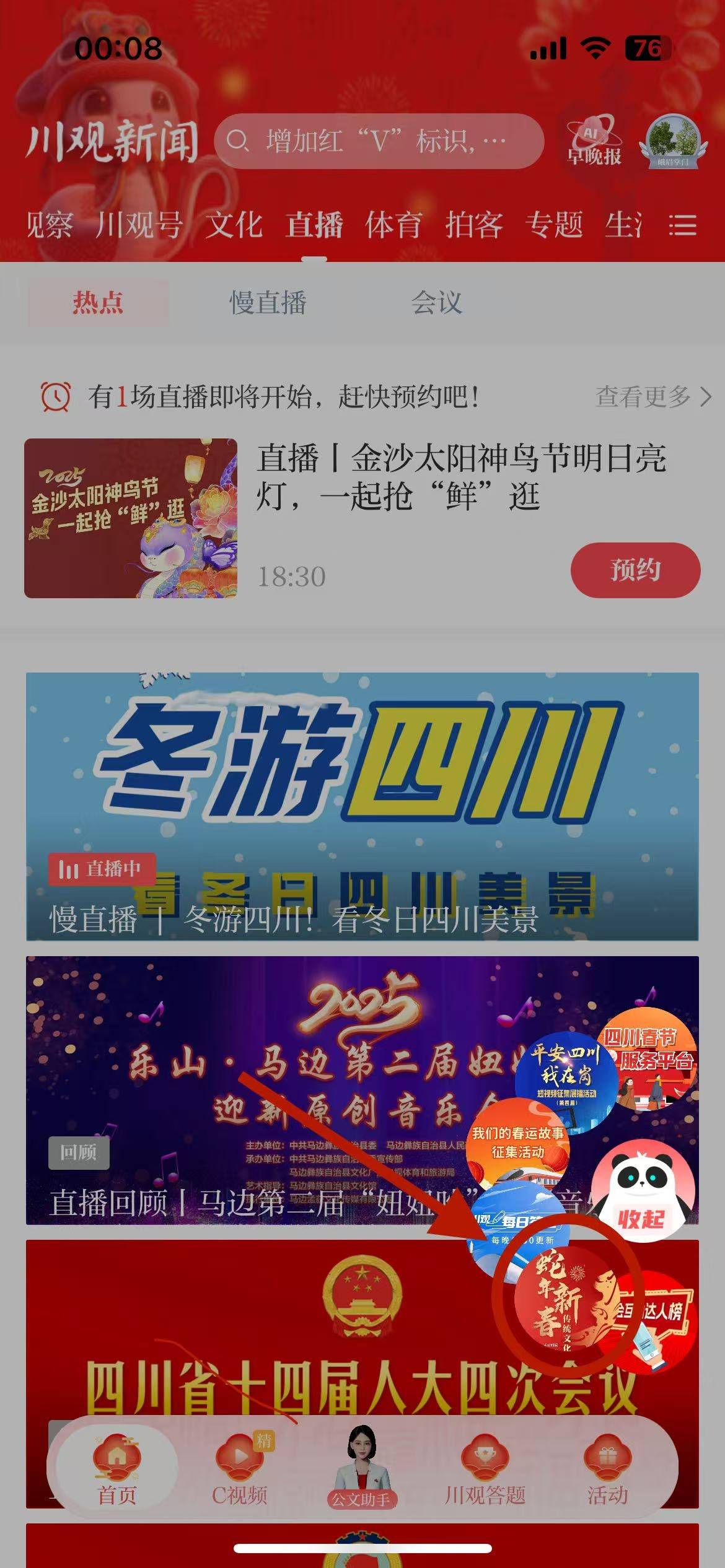 方式一:在川观新闻首页,点击右下方悬浮球,找到“蛇年新春”活动图片,点击即可参与;