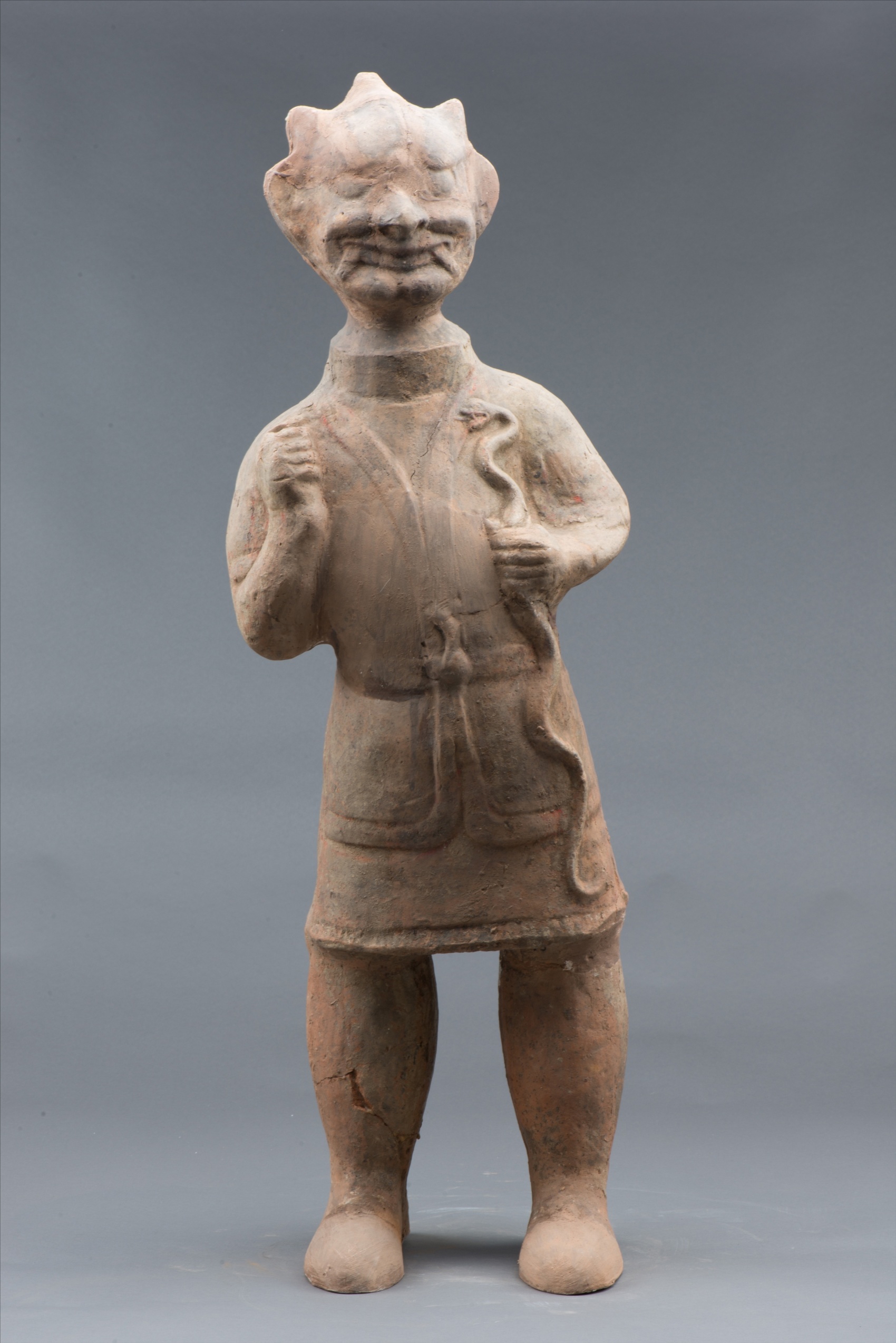 这件文物出土于青白江区祥福镇马坪村,长31厘米,宽23厘米,高89厘米。该俑造型夸张,头顶有角,面目狰狞,嘴露獠牙,左手握蛇,呈站立状。