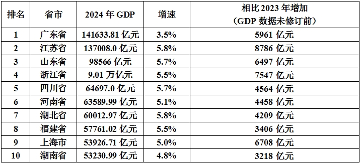 以同样的上述方式计算,江苏增加了8786亿元,与广东的差距从2023年(修订前)的7451亿元,缩小为2024年的4625.81亿元。浙江增加了7547亿元,与山东的差距从2023年(修订前)的9516亿元,缩小为2024年的8466亿元。