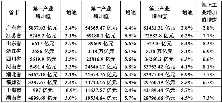 就各省市三次产业占比而言,农业在本省市GDP占比中超过8%的有4个,湖南(9.2%)、湖北(9.1%)、四川(8.7%)、河南(8.6%);第二产业占比超过40%的有3个,江苏(43.2%)、福建(42.8%)、山东(40.2%);第三产业占比超过55%的有4个,上海(78.2%)、浙江(58.6%)、广东(57.5%)、四川(56%)。