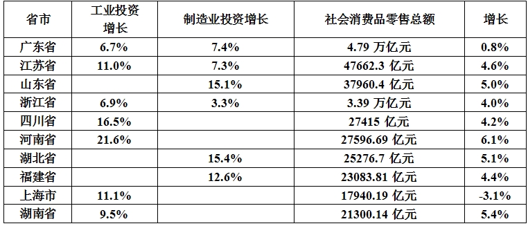 单从经济增速看,十大经济省市中有7个高于全国增速,江苏、湖北增长5.8%并列第一,山东、四川增长5.7%并列第二。