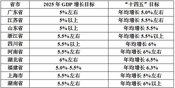 每个地方的目标设定,均兼顾需要和可能,既“积极进取”又“切实可行”。而且,2025年是“十四五”规划收官之年,年度经济运行情况决定了能否完成“十四五”目标任务,并为“十五五”顺利开局蓄势聚能。以山东省为例,其确立的“十四五”年均增长目标为5.5%,而在前四年分别实现增长8.3%、3.9%、6.0%、5.7%,2025年预期增长5%以上,有利于顺利完成甚至超额完成“十四五”目标任务。
