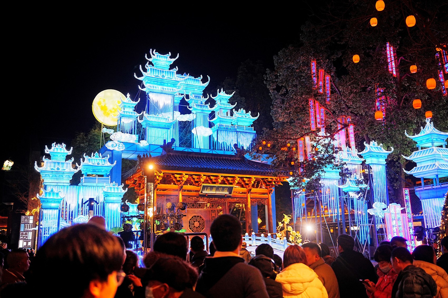 展翅火凤、时光隧道、花开富贵、锦城春色……作为临邛古城生活节重要内容之一,2025临邛古城灯会已在大北街-兴贤街拉开序幕,近百组造型各异、创意迭出的花灯映照夜空。同时,今年临邛古城灯会的灯组设计,还充分融入邛崃在地文化、人文风情和特色产业。从中国酒源、文君故里,到临邛四绝、千年邛窑;从赛博街区、乖萌熊猫到秀美天台山,行于其间,也开启一场“崃”式漫游。