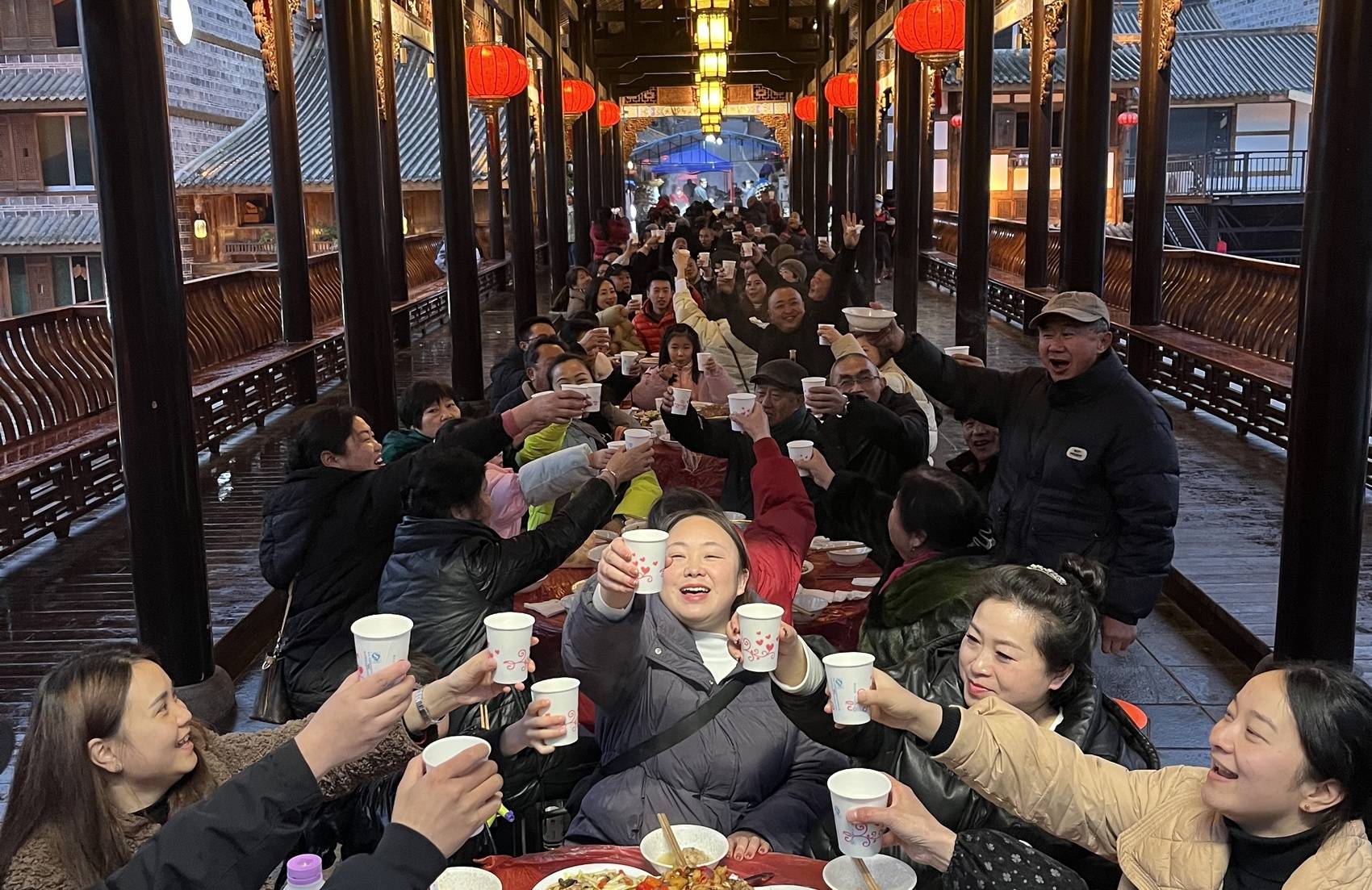 大年初二中午,在“中国博物馆小镇”安仁的长街宴广场,一场热闹非凡的长街宴拉开大幕。国家级非遗鼓上舞、川剧变脸艺术精彩上演。在锣鼓齐鸣中,地道川西“九碗闹春”盛宴开席。席间古筝与民乐联奏,悠扬的旋律为这场盛宴增添优雅氛围,数百游客亲身体验了这场新春舌尖之旅。