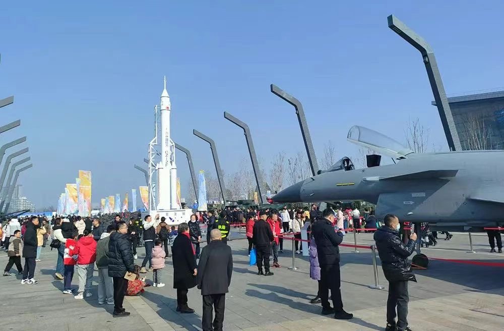 在飞机展示区域,游客们纷纷拿起手机拍照。“小朋友特别喜欢飞机,知道这里有航天科技展,特意让孩子感受下中国科技的强大。”带孩子来体验航天文化的游客张安刚说。
