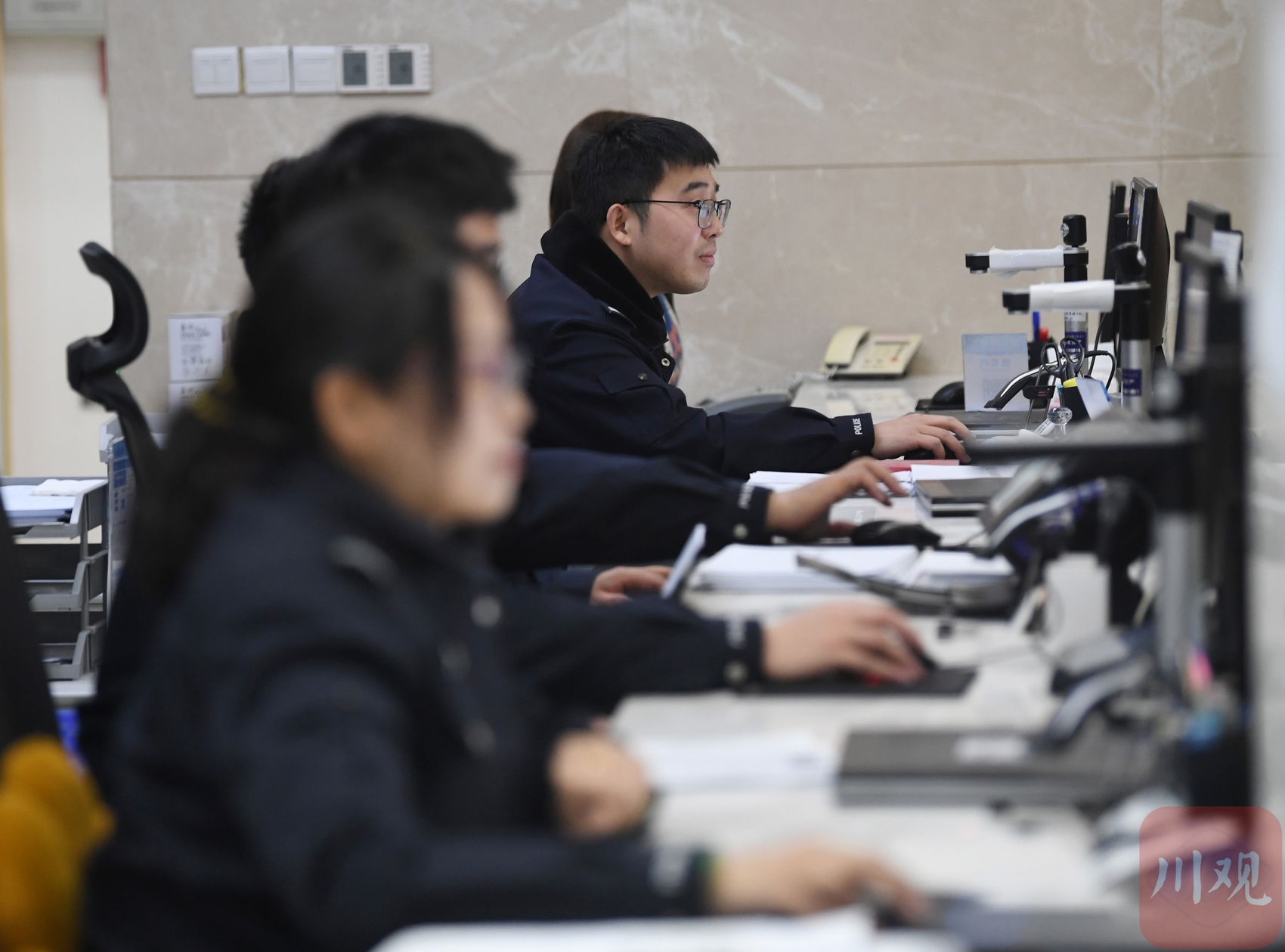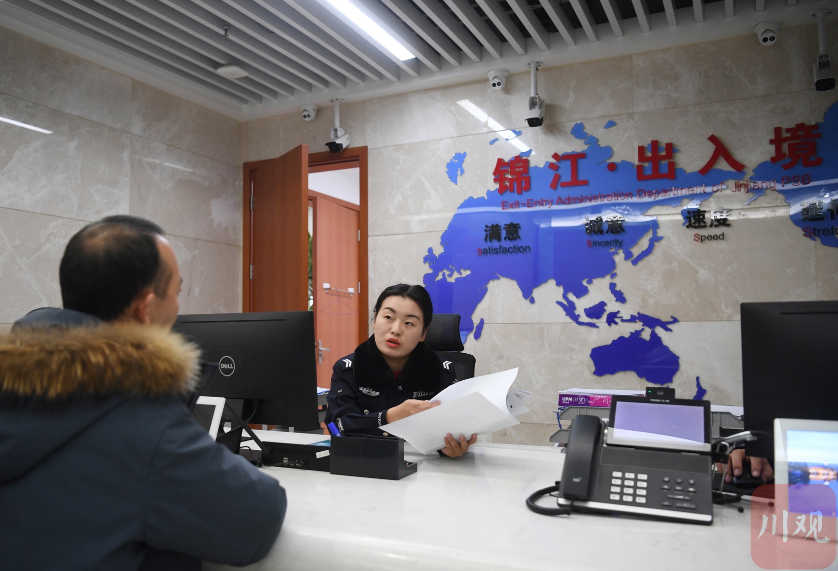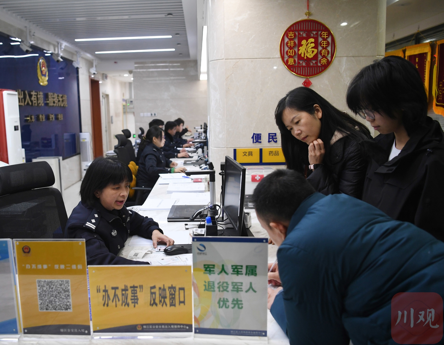 “出入境大厅是对外开放的一面镜子。我们要让群众办事更有‘宾至如归’的感觉。” 成都市公安局锦江区公安分局出入境大厅民警陈俐表示。