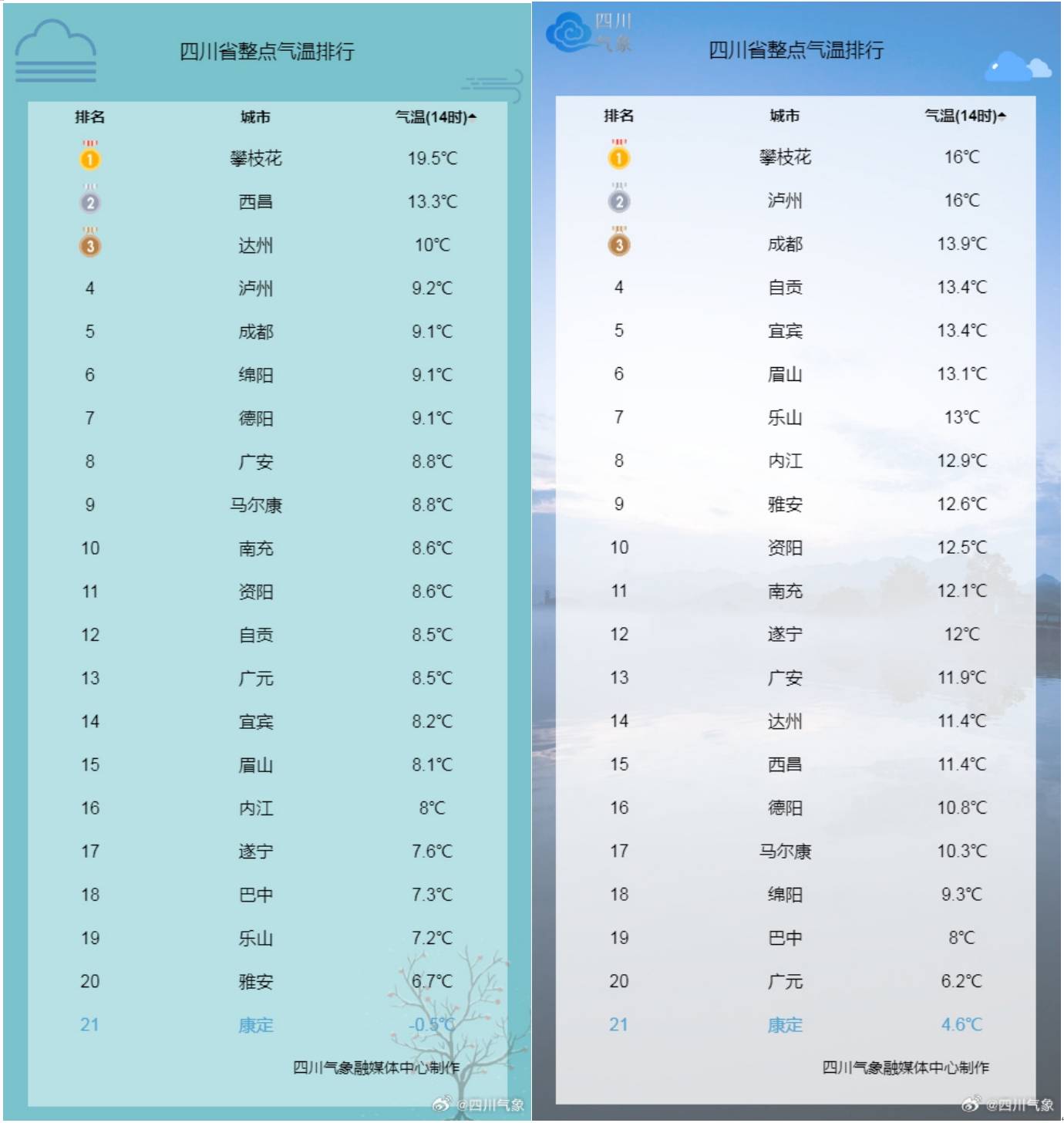 来自四川省气象台的观测结果显示,从昨天到今天,四川各地气温下降明显。